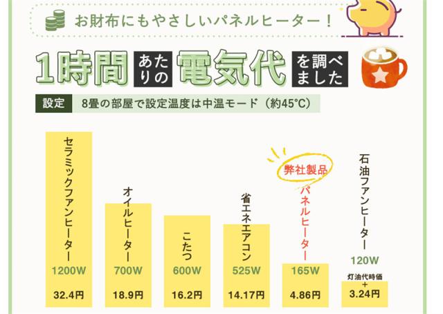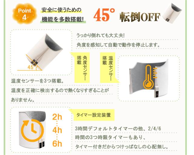 【高い安全性】電気をエネルギーとしているので、一酸化炭素中毒や火事などの事故が起こりにくいのもポイント。加えて、表面はパネルで覆われているため火傷の心配が少ないのもメリット。また、パネルヒーターが誤って倒れた場合に運転を停止する「転倒OFF機能」と電源を切り忘れることを防止するための「タイマー機能」を備えているので、小さな子供やペットがいる家庭でも安心して使用できます。