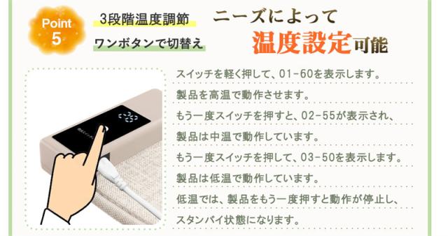- ラウンド型で中温度で使用しています。高温では熱いくらいです。 ラウンド型にすると、熱も逃げ難く暖かいのは良いのですが、出るのが出にくいです。 付属の毛布は肌触りは、とても良いのですが小さ過ぎてその上...