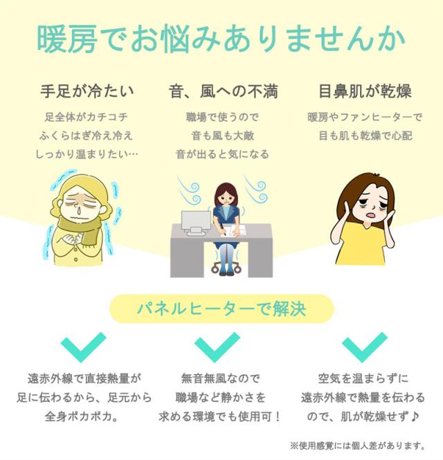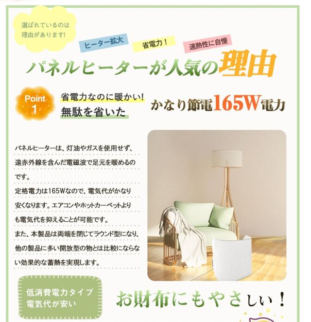 - 足がいつも冷えて寒くテーブルで過ごす事が多いので足元用にパネルヒーターを買いました。熱さは調節できるのでいい買い物ができました。この冬大活躍しそうです。