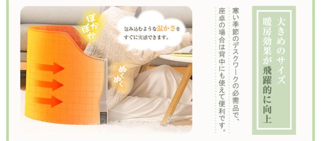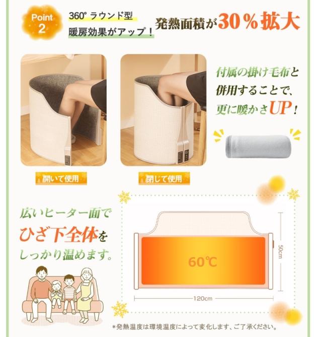 【効果的に蓄熱できるラウンド型】両端を閉じてラウンド型になり、他の製品に多い開放型の物とは比較にならない効果的な蓄熱を実現します。高めのデザインなので、ふくらはぎ側も温めてくれます。さらに、付属の毛布を被せると、コタツのように足元をスッポリカバーしてくれて、暖房効果が飛躍的に向上します。
