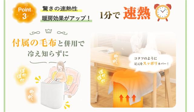 2.驚きの速熱性、電源を入れたら直ぐに暖かくなります。