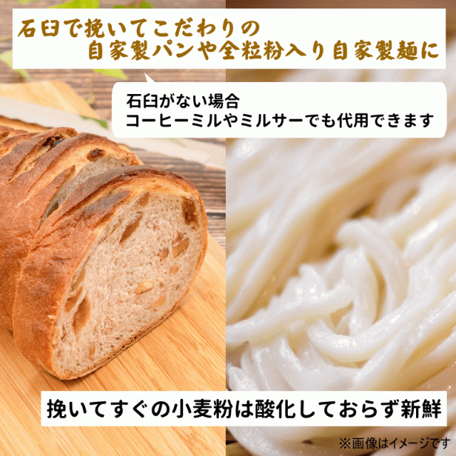 ・小麦を挽く場合、ミキサーで製粉すると熱を持ち熱変性と酸化をしてしまうため、石臼か製粉ロール、またはコーヒーミル、ミルサーなどで製粉してください ・全粒粉の小麦粉をパンなどに使用する場合、柔らかくする目的と消化をよくするため、沸騰したお湯を加えるなどして下処理をしてください。 |