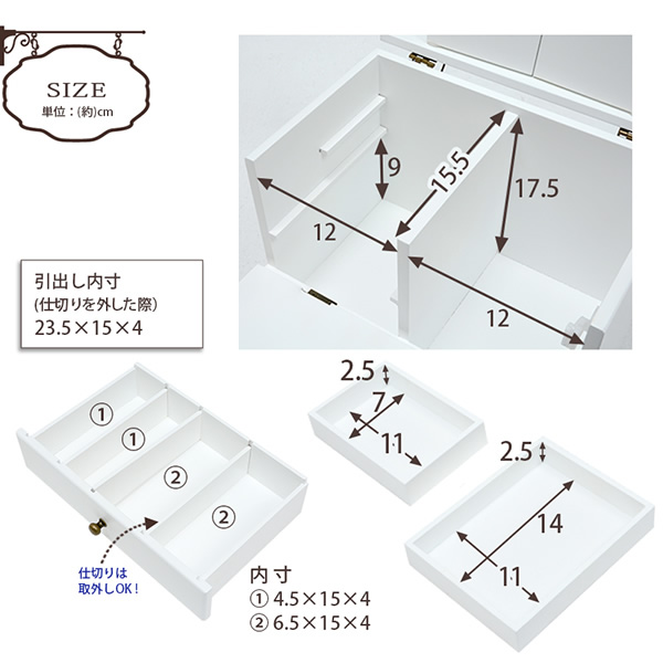 アンティーク風の金具が大人かわいいコスメボックス。メイクチェックもしやすい三面鏡タイプ ■サイズ (約)幅27×奥行18×高さ35cm ■素材 主材:MDF ※写真はメーカー様のカタログ等から掲載させて頂いております。 実物の商品と写真の色が若干写真写り等により異なる場合がありますのでご注意くださいませ。 万が一の際でございましても返品はお受け致しかねます。 ※写真に写っている小物などは付属しておりません。 ※お客様組立て品につきましては、組み立て後に不良の連絡をされても対応ができません。 組み立て前にパーツに不良・傷等がないか、必ずご確認下さいます様よろしくお願い申し上げます。 ※記載は商品仕様の一部です。仕様説明不足等の理由での返品はできません。特に適合等は必ずご確認ください。