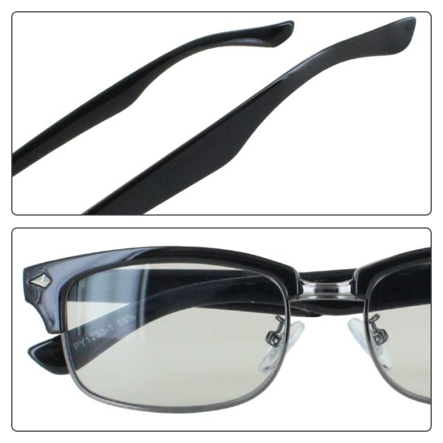 | PY1233-1 フレームカラー:ガンメタル+ブラック レンズカラー:ライトスモーク PY1233-2 フレームカラー:ゴールド+ブラウンデミ レンズカラー:グリーン PY1233-3 フレームカラー:ガンメタル+ブラック レンズカラー:ブルー PY1246-1 フレームカラー:ゴールド+ブラック レンズカラー:スモーク PY1246-2 フレームカラー:ゴールド+ブラック レンズカラー:ブルー PY1246-3 フレームカラー:ゴールド+ブラック レンズカラー:パープル | レンズわく素材:プラスチック、ニッケル合金 テンプル素材:プラスチック レンズ素材:プラスチック 可視光線透過率 PY1233-1 55% PY1233-2 15% PY1233-3 65% PY1246-1 10% PY1246-2 70% PY1246-3 50% |