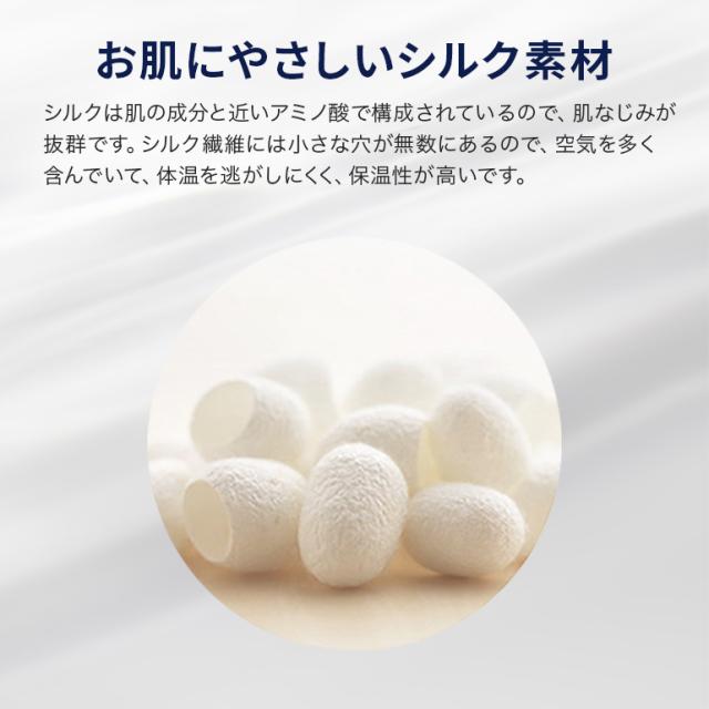 ・素材のシルクは肌の成分とそっくりのアミノ酸で構成されているので、肌なじみが抜群です。また、シルク繊維には小さな穴が無数にあるので、空気を多く含んでいて、体温を逃がしにくいです。