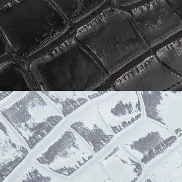 本体素材にはタンニンでしっかりと鞣されたコシのある牛革を使用しています。そこにメタル箔を貼り、クロコの型押しを施し、色を抜き取ることでビンテージ感あるデザインに仕上げました。