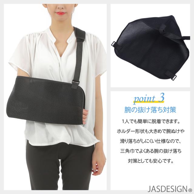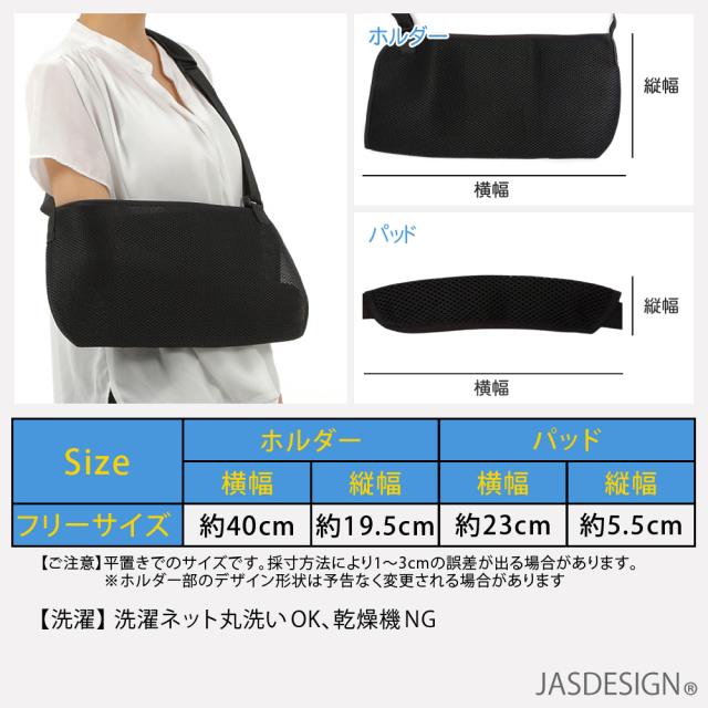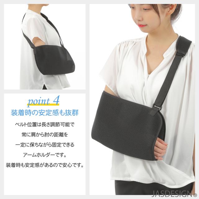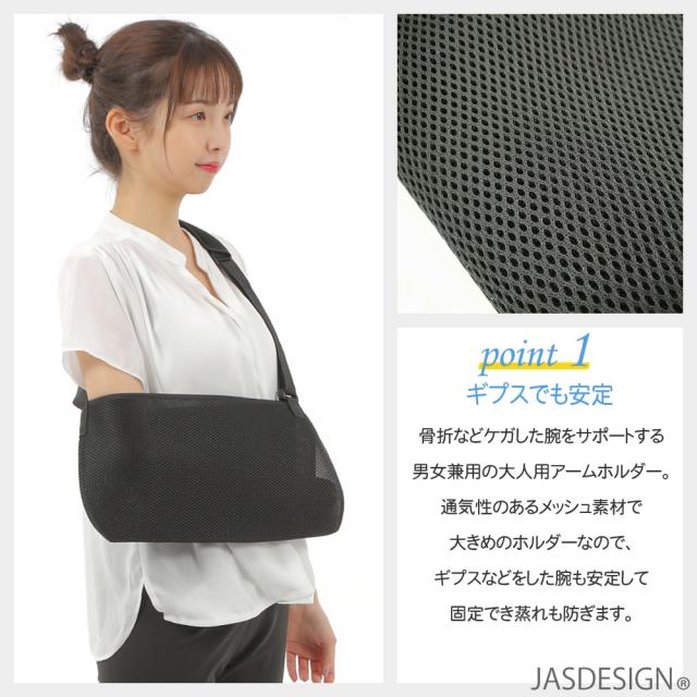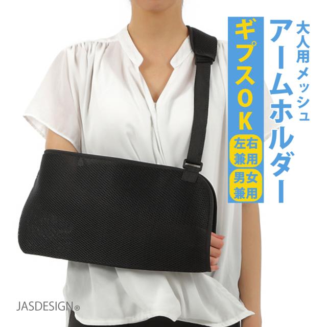 通気性のあるメッシュ素材で大きめのホルダーなので、ギプスなどをした腕も安定して固定でき蒸れも防ぎます。