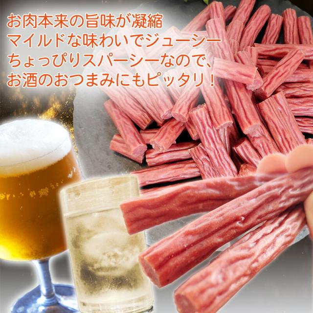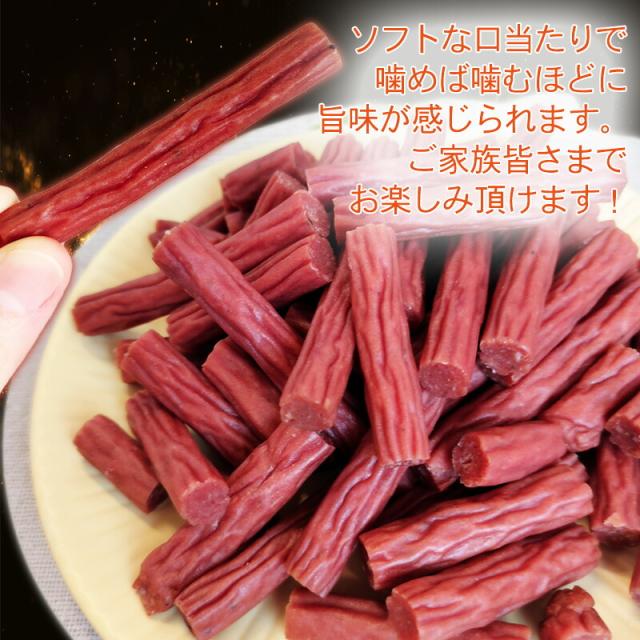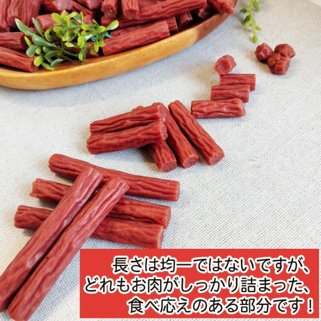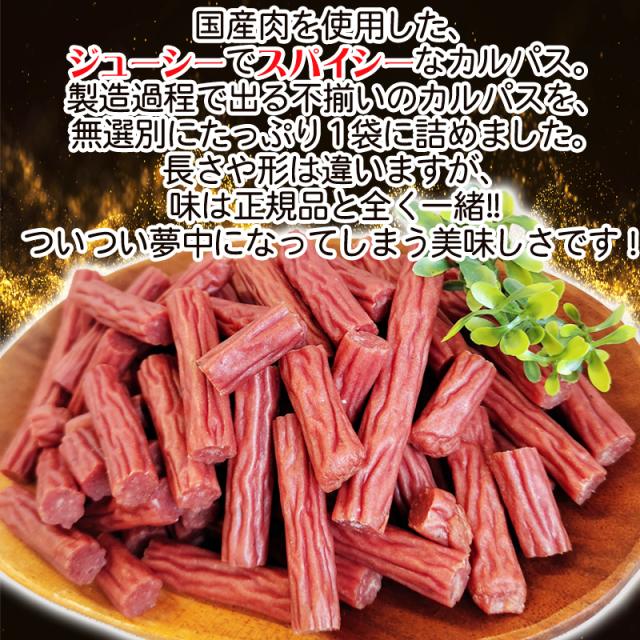 主に国産のお肉を使用した、 ジューシーでスパイシーなカルパス。 製造過程で出る不揃いのカルパスを、 無選別にたっぷり1袋に詰めました。 長さや形は違いますが、 味は正規品と全く一緒! ついつい夢中になってしまう美味しさです!