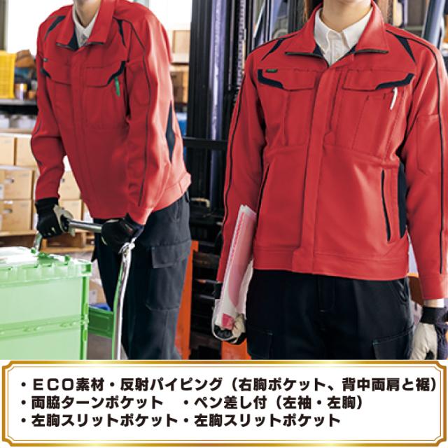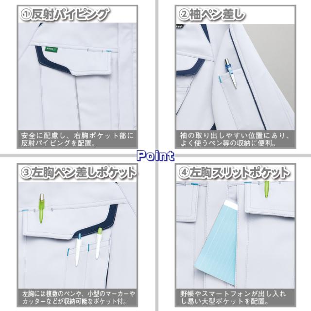 ◇機能:反射パイピング・袖ペン差し・左胸ペン差しポケット・左胸スリットポケット・IDハンガー・身頃ポケット・スポーツカット・背部反射パイピング・袖部反射パイピング・帯電防止・エコ商品・反射材使用・ストレッチ・ドットボタン/プラスチック・ファスナー/ビスロン(スライダー/プラスチック)・タックボタン/プラスチック