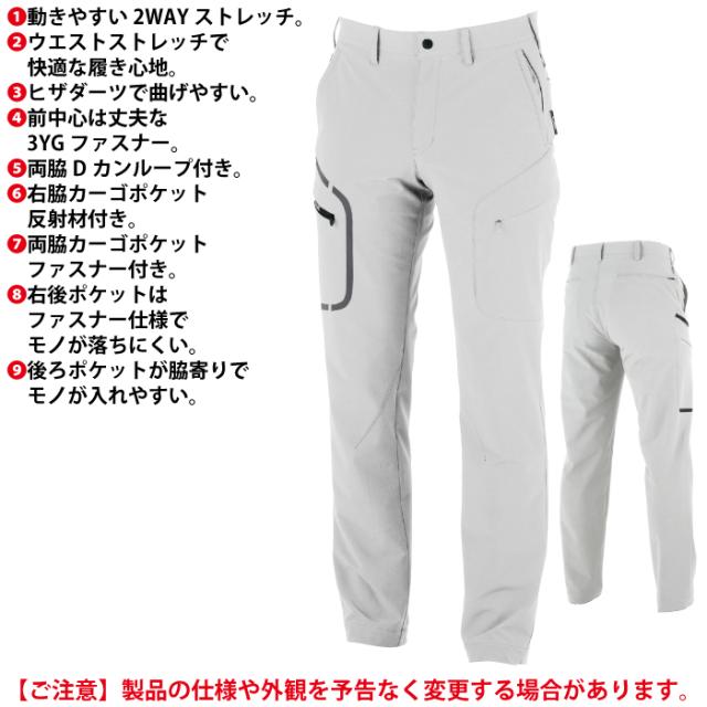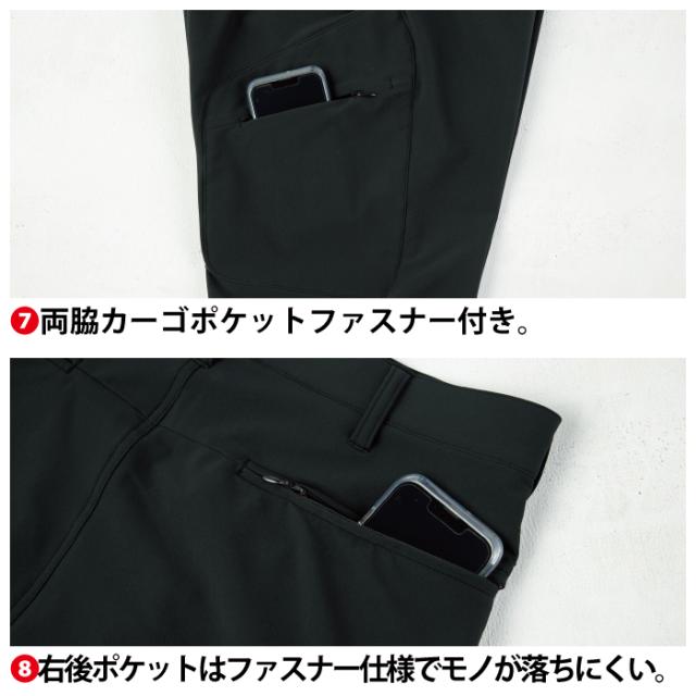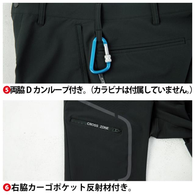 ◇前中心は丈夫な3YGファスナー 両脇Dカンループ付き 右脇カーゴポケット反射材付き