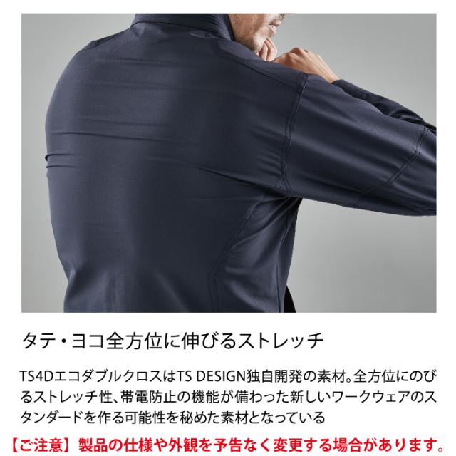 ◇タテ・ヨコ全方位に伸びるストレッチ素材・TS 4DエコダブルクロスはTS DESIGN独自開発の素材。全方位に伸びるストレッチ性帯電防止の機能が備わった新しいワークウェアのスタンダードを作る可能性を秘めた素材となっている。