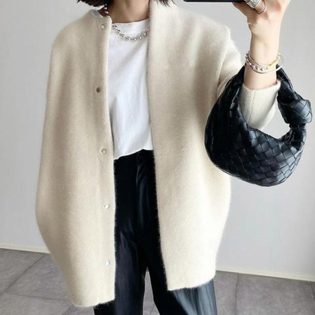 ステンカラーのニットコートは軽やかで快適な着心地がGOOD