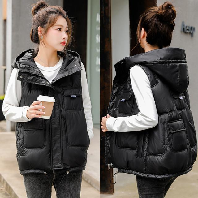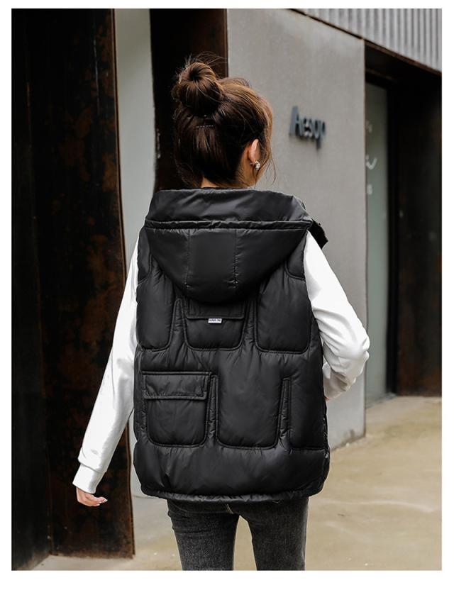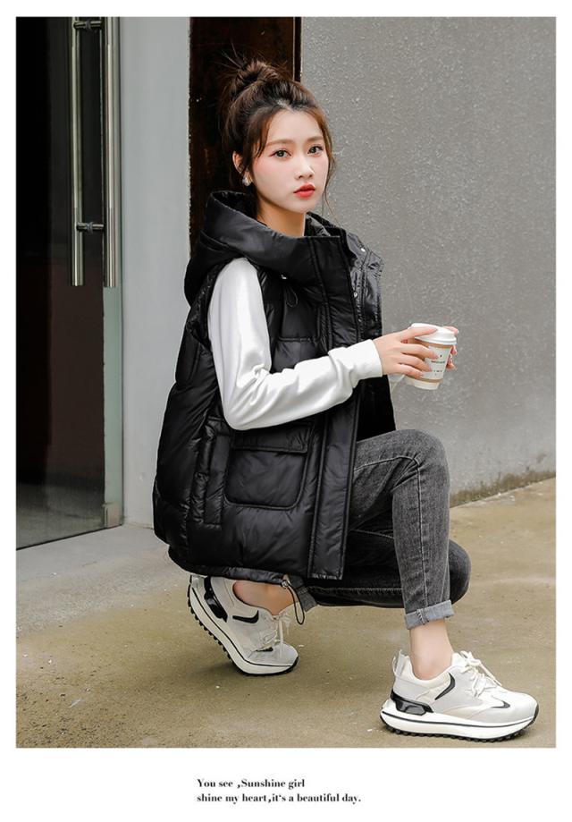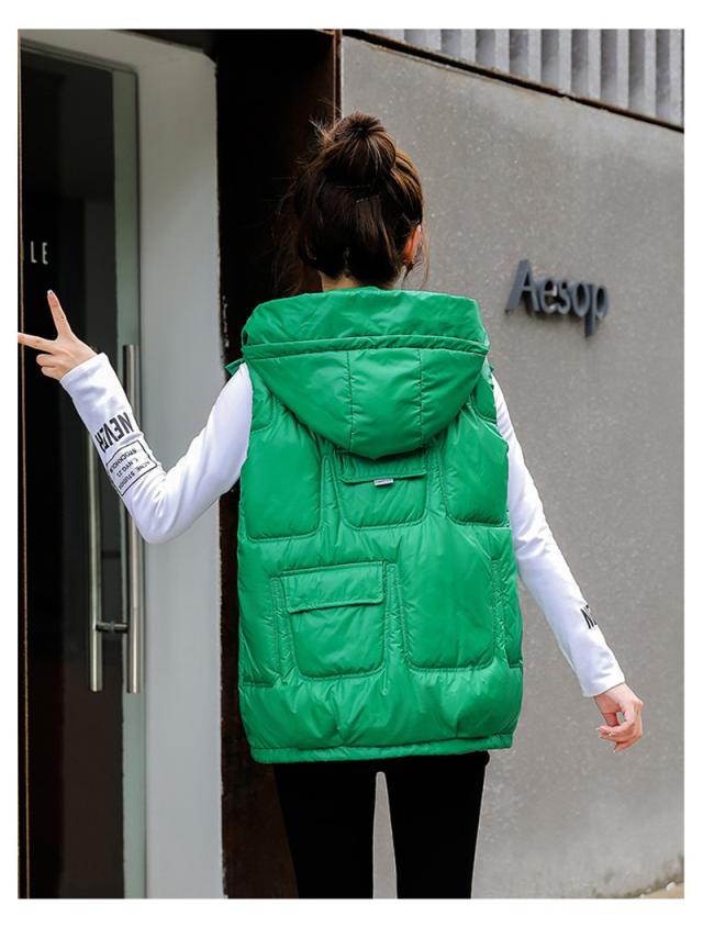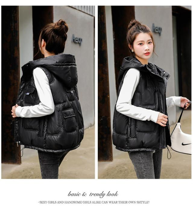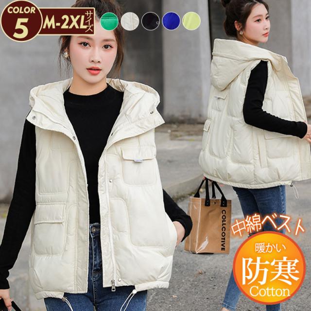 中綿ベスト レディース ベスト アウター ショート丈 フード付き 光沢感 ゆったり 柔らか 無地 厚手 防寒 着痩 撥水 通勤 秋