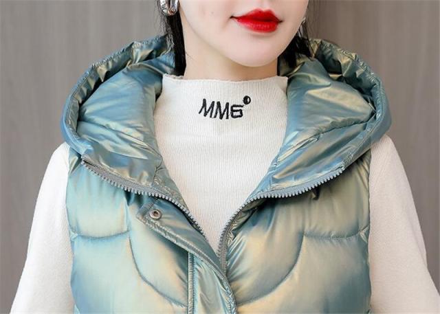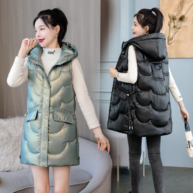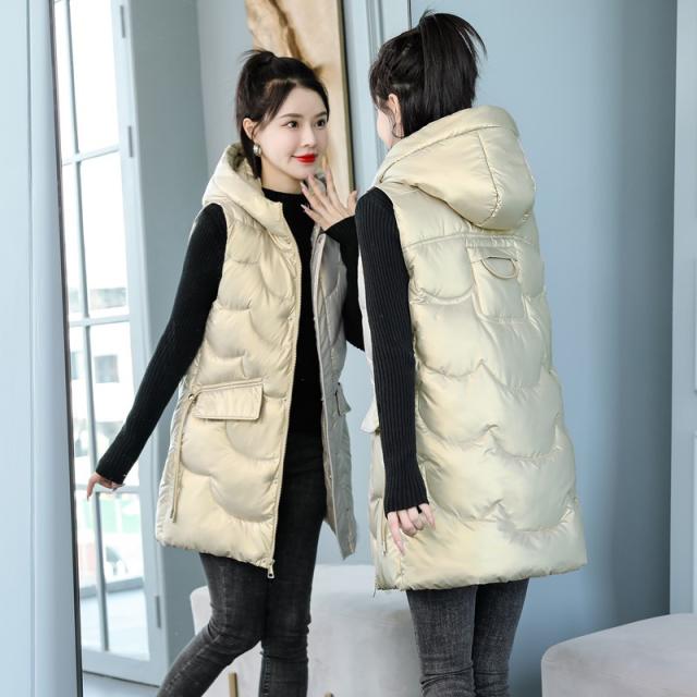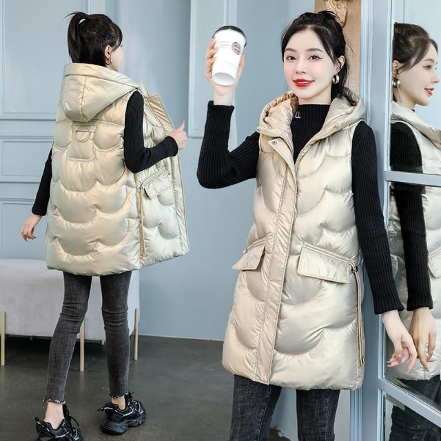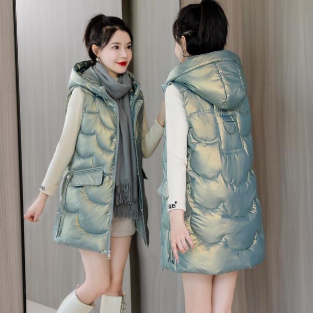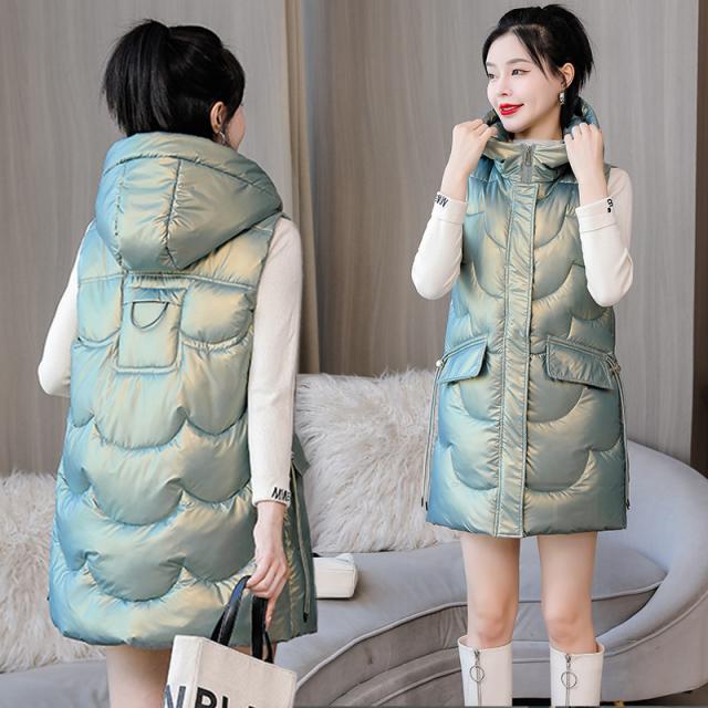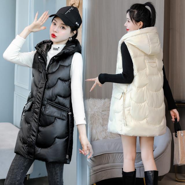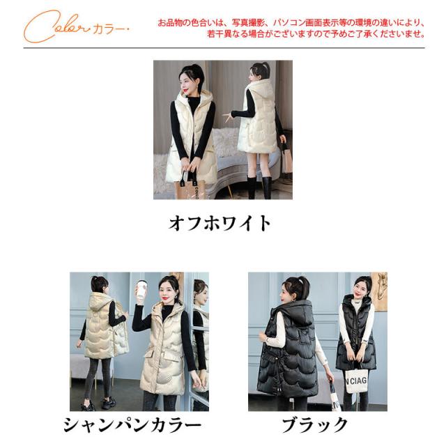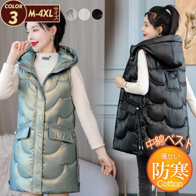 中綿ベスト レディース ベスト ロング丈 アウター フード付き ゆったり 光沢感 無地 暖か 大きいサイズ 防寒 着痩 通勤 秋冬