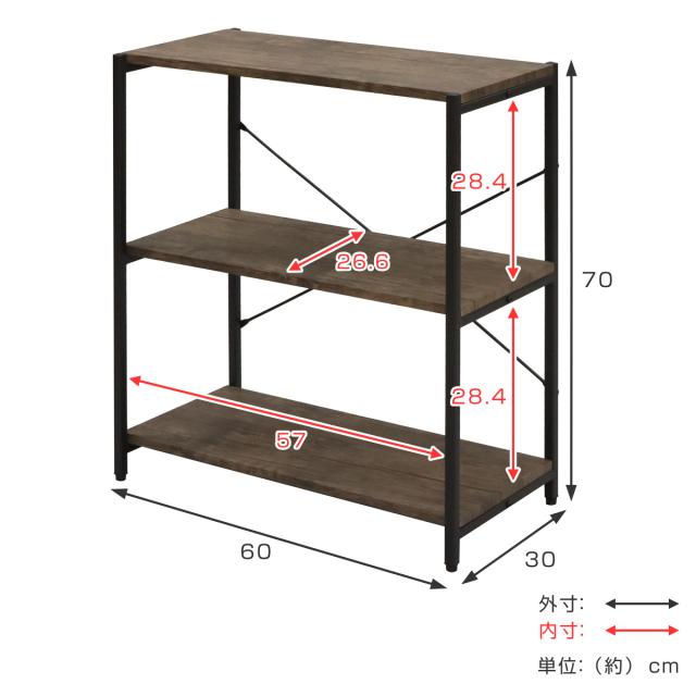 ダークブラウンがシックなヴィンテージ調収納ラック3段 幅60cm