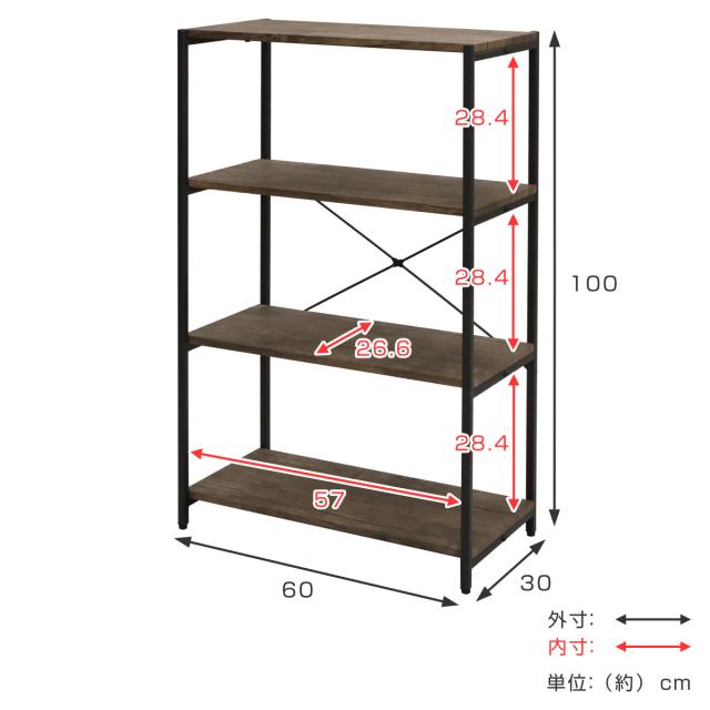ダークブラウンがシックなヴィンテージ調収納ラック4段 幅60cm