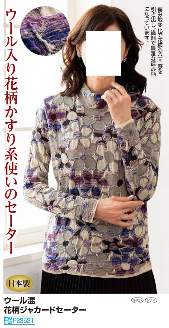 日本製 ウール混 花柄ジャカードセーター パープル トップス ハイネック ニット 薄手 レディース 婦人服 ミセス シニア 女性 50代 60代 70代 80代 シニアファッション 母の日 お母さん モックネック 上品 毛混 ウール混 紫 ベージュ系