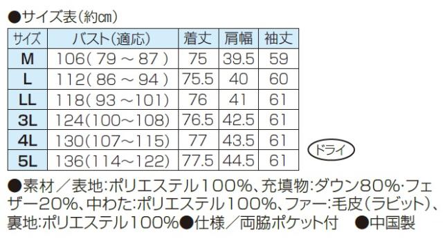 ●素材/表地:ポリエステル100%、充填物:ダウン80%・フェザー20%、中わた:ポリエステル100%、ファー:毛皮(ラビット)、裏地:ポリエステル100%