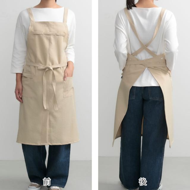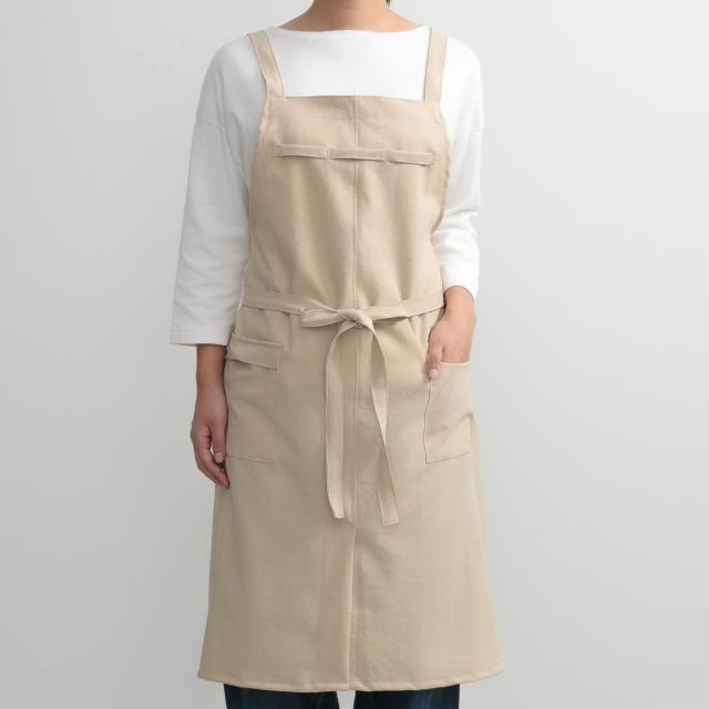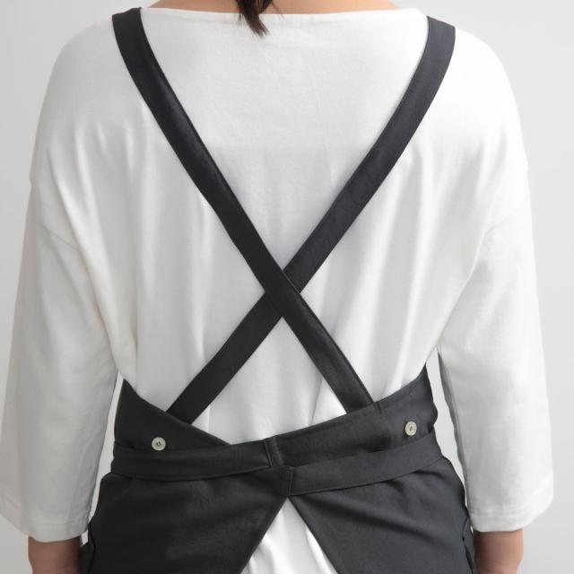 バッククロスタイプで、肩への負担が少なく肩ひもがズレにくいです。長時間つけいていても疲れにくいから作業やお料理がはかどります。