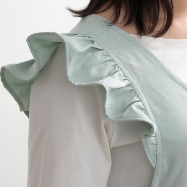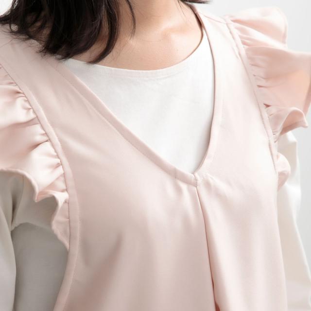 肩のフリルはたっぷりのギャザーで作られています。大人かわいいフリルは存在感があり、女性らしさを演出してくれます。