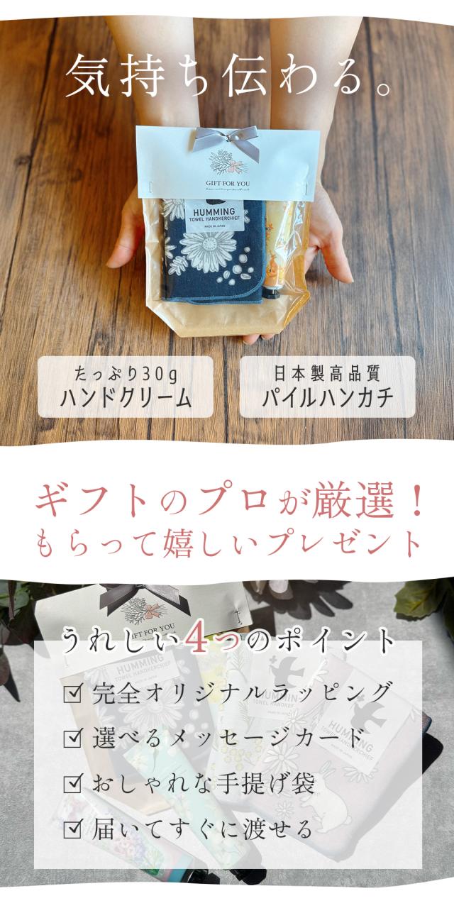たっぷり30g入りハンドクリームと日本製タオルハンカチのギフトです。