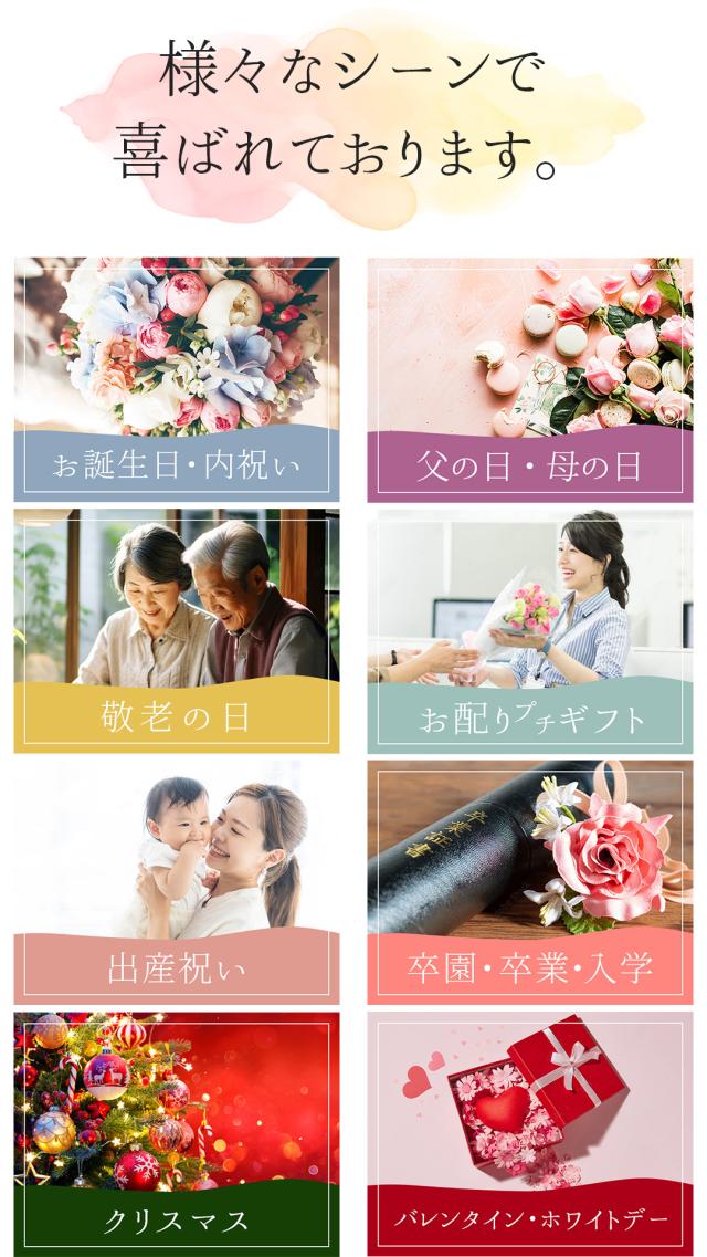 誕生日プレゼントや母の日ギフトの定番、冬の季節ではクリスマスや歓送迎会シーズンの定番です。