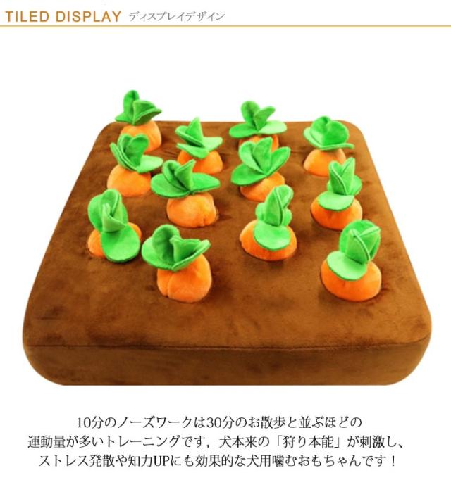 | 人参収穫隊集合:犬のストレスを解消しながら、自分の力でおやつをゲット。10分のノーズワークは30分のお散歩と並ぶほどの運動量が多いトレーニングです,犬本来の「狩り本能」が刺激し、ストレス発散や知力UPにも効果的な犬用噛むおもちゃんです! 飼い主への楽しみ:愛犬に合わせて難易度を変えながら、見つからないように隠す、そして愛犬は一生懸命おやつを探す、全部見つけられたらいっぱい褒めてあげて、飼い主も癒やされるでしょう。 | |