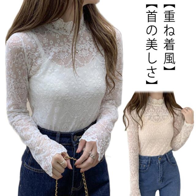 送料無料 裏起毛 レース トップス インナー 秋冬 重ね着 ハイネック レイヤード風 レディース 裏起毛 インナー レース 繊細レース 見せるインナー 長袖 大人可愛い