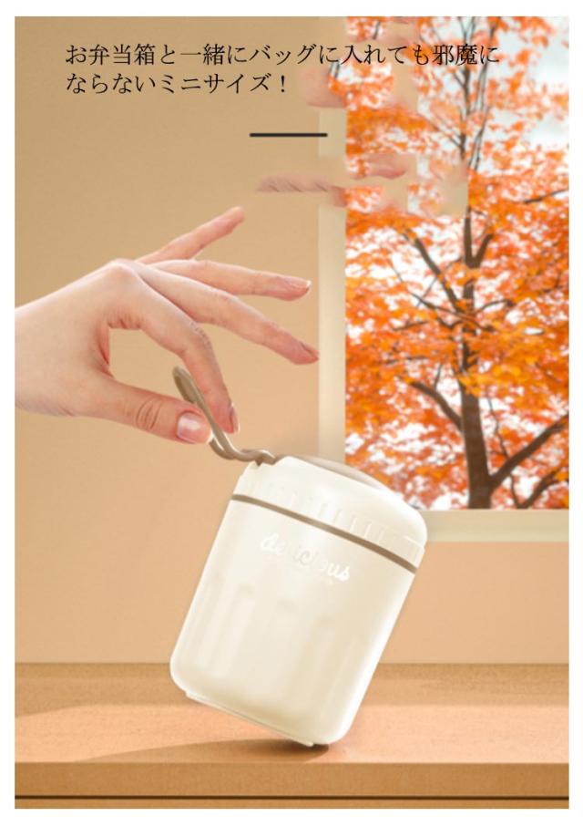 | スプーン付き、携帯便利なスープジャー ステンレスによる真空二層構造で、食べごろの温度をキープしたまま持ち運べます。 お弁当箱と一緒にバッグに入れても邪魔にならないミニサイズ! 高い密閉性で中身が漏れる心配なく持ち歩けます。 便利なスプーン付き、フタカバーを開けるとスプーンが収納されていて便利です。 汚れやニオイがつきにくいので食材の臭いや汚れが残りません。さらに丸洗い出来る本体でお手入れも簡単です。 | |