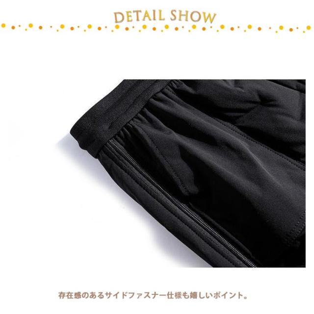 | 軽い着心地なのに、熱を逃がしにくい中綿ダウン風パンツ。 存在感のあるサイドファスナー仕様も嬉しいポイント。 防寒着ならこれ!軽い中綿素材を入り、防寒対策バッチリ。 スリムな裾が冷気の侵入を防ぎ、熱も逃がしにくいのでしっかり暖か。 お部屋着としてはもちろん、外出時やレジャーなどウォーキングや自転車など、スポーティーなシーンにもおすすめ。 | |