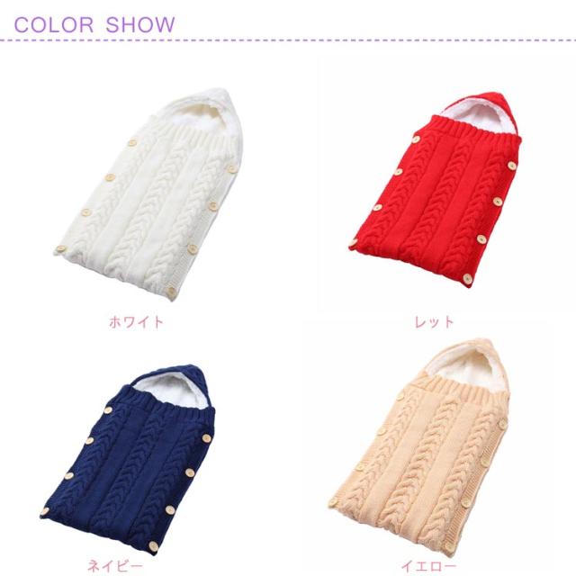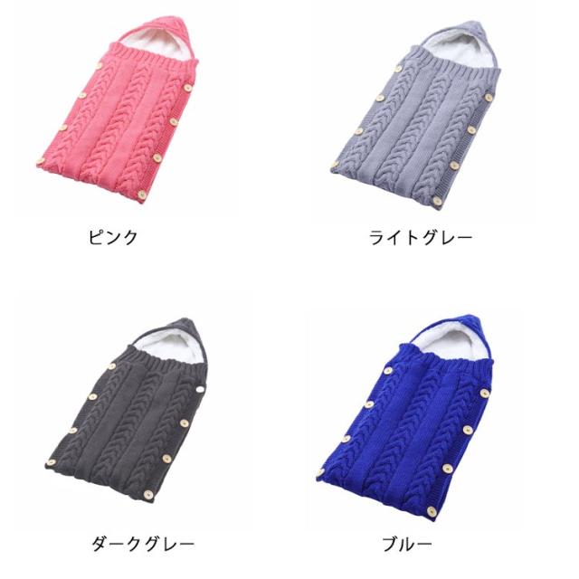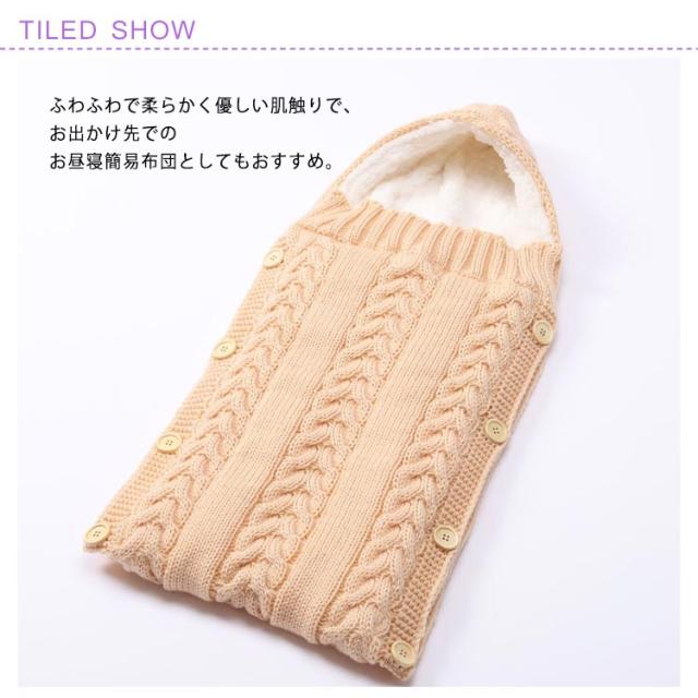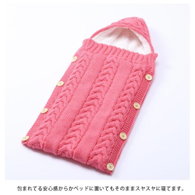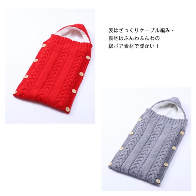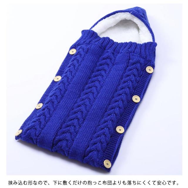 | 秋冬に大活躍するニット素材が可愛いポケット型ベビー寝袋。 挟み込む形なので、下に敷くだけの抱っこ布団よりも落ちにくくて安心です。 表はざっくりケーブル編み・裏地はふんわふんわの総ボア素材で暖かい! 包まれてる安心感からかベッドに置いてもそのままスヤスヤに寝てます。 ふわふわで柔らかく優しい肌触りで、お出かけ先でのお昼寝簡易布団としてもおすすめ。 | |