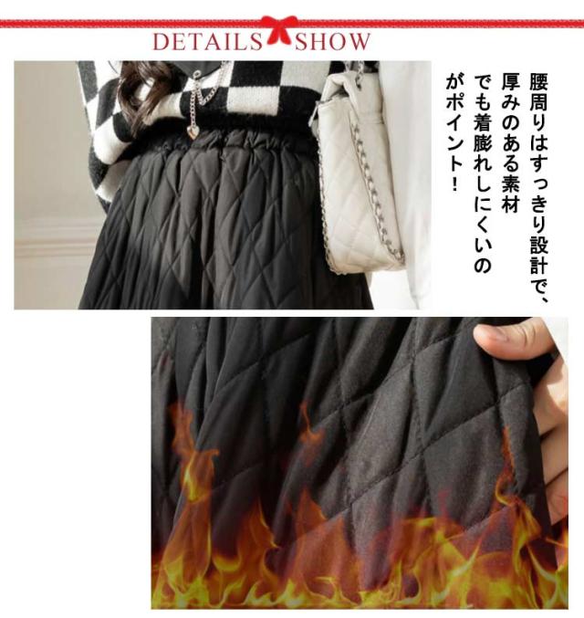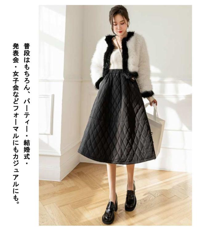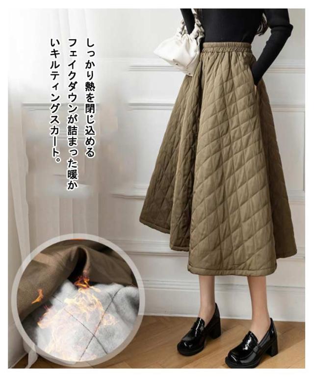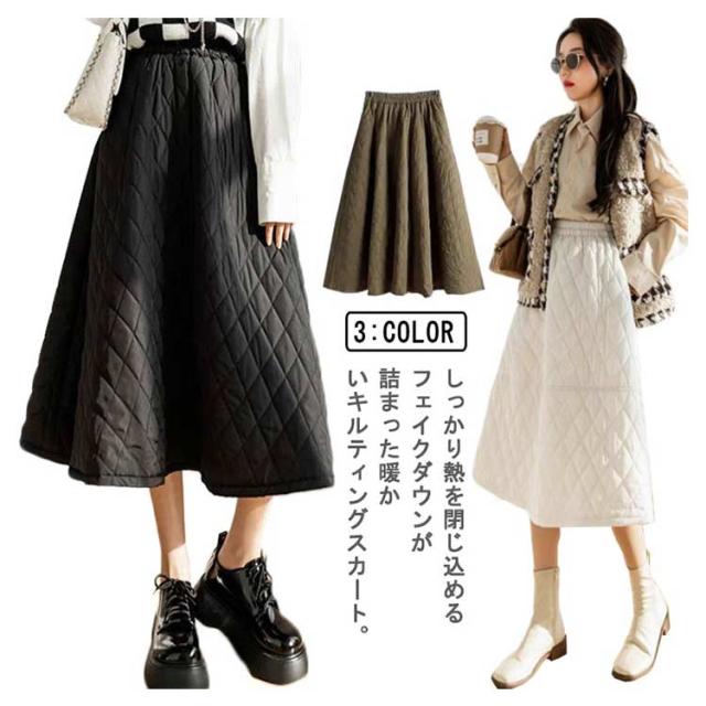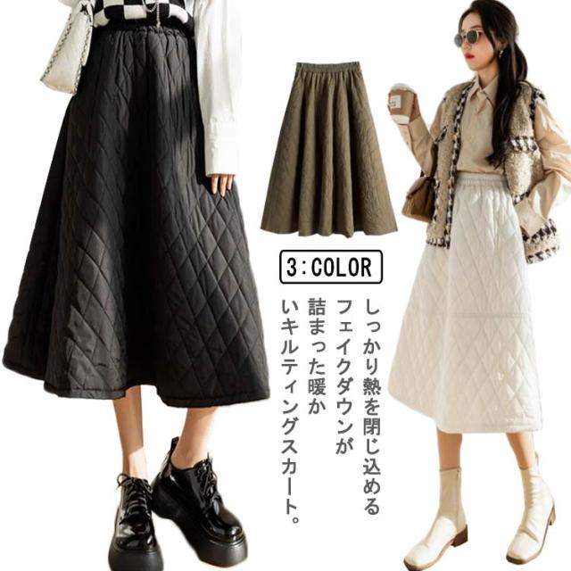 スカート キルティングスカート 中綿 ミモレ丈 膝下 ロングスカート フレアスカート Aライン ウエストゴム 暖かい 冬服 レディース 可愛い あったか ボトムス きれいめ ハイウエスト シンプル 通勤 オフィス 大きいサイズ カーキ 黒 ベージュ 送料無料