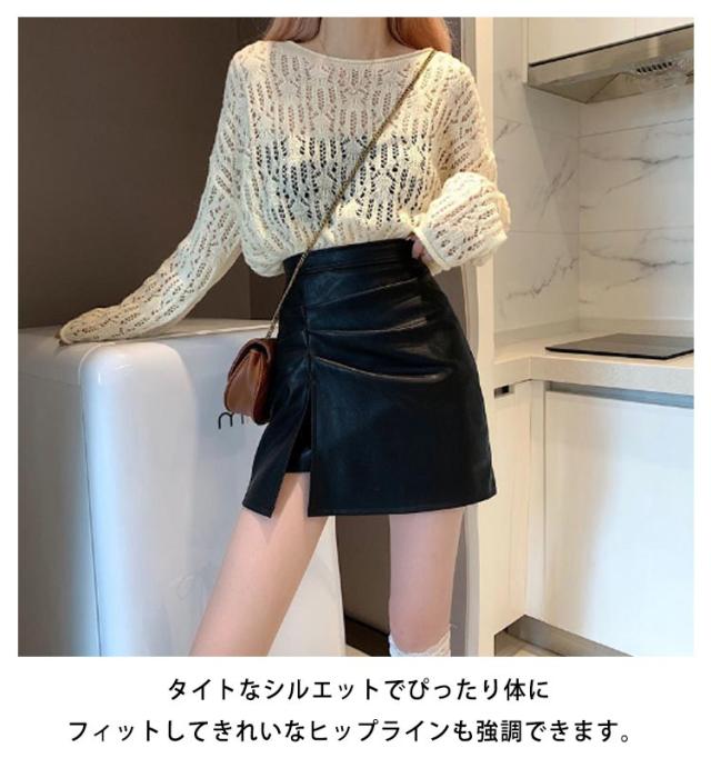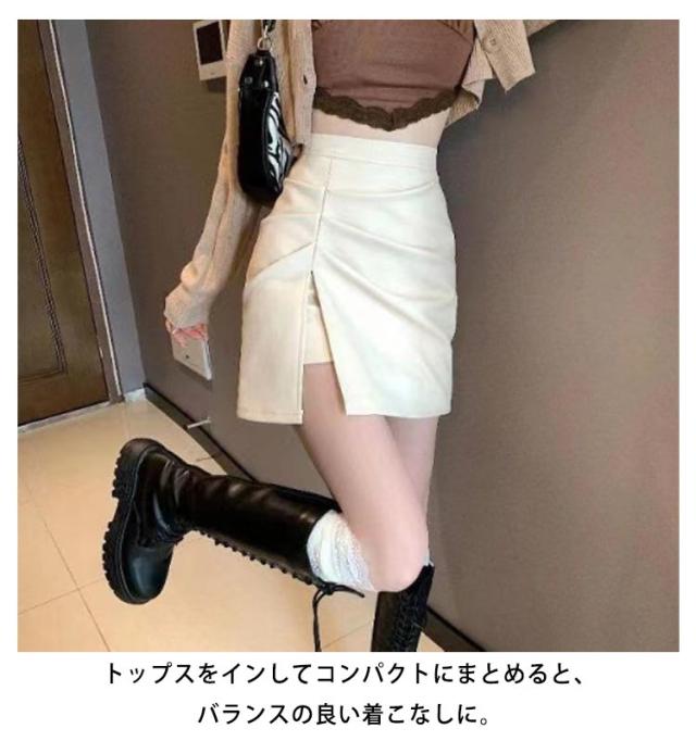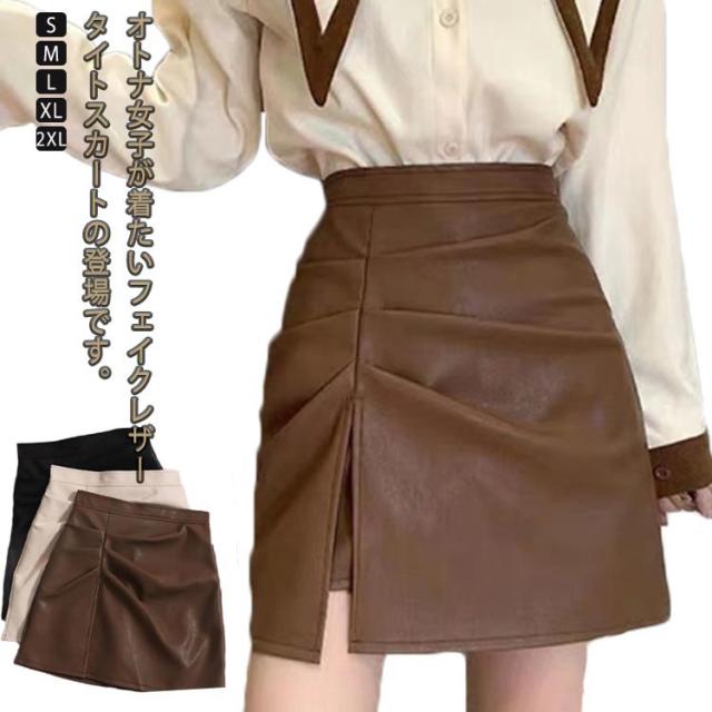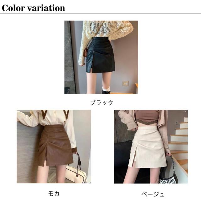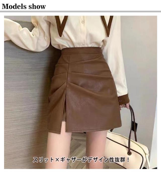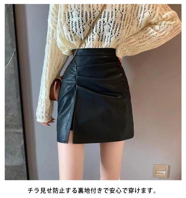 スリット×ギャザーがデザイン性抜群!裏地付き フェイクレザースカート フェイクレザータイトスカート フェイクレザー タイトスカート ミニスカート ペンシルスカート ハイウエスト タイト ミニ 膝上丈 aライン 秋 春 冬 チラ見せ防止
