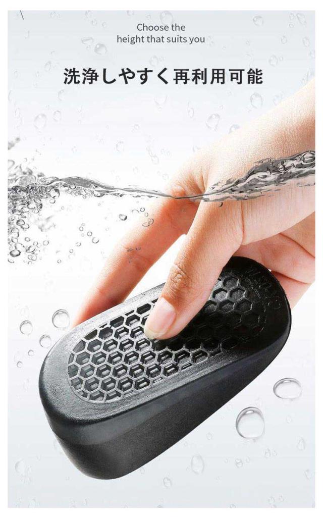 | 中敷きとしてお手持ちの靴に入れるだけで簡単にヒールアップしてくれます。 外から見えずこっそり身長がアップし、腰の位置が上がり、足が長く、身長アップ&スタイルアップすることができ、本来の自信が増えます。 シークレットインソールはシリコンを使用して、高い衝撃吸収力とかかとに掛かる圧力を分散できます。 歩行時のかかとの動きを安定させ、足の疲れ、足底筋膜炎、踵骨棘などによる足の負担を緩和させます。 (1.5cm/2.5cm/3.5cm)三つタイプがあり、ご好みより自由に選べます。 インソールはほとんどの靴、ブーツ、革靴、スポーツシューズ、キャンバスシューズ、ハイヒール、テニスシューズ、ゴム靴などに適しており、学校、仕事、通勤、スポーツ、パーティー、日常のレジャーに使用できます。 | |