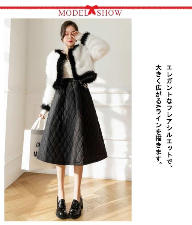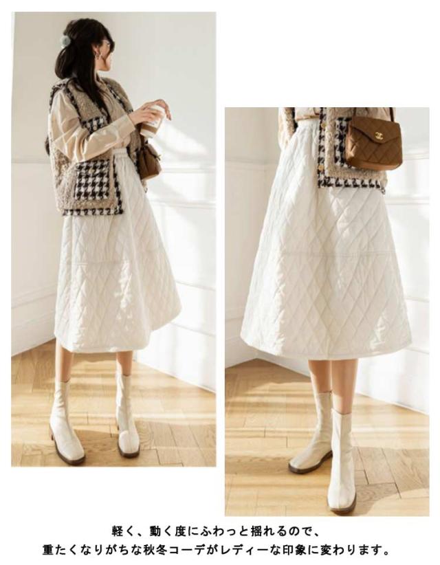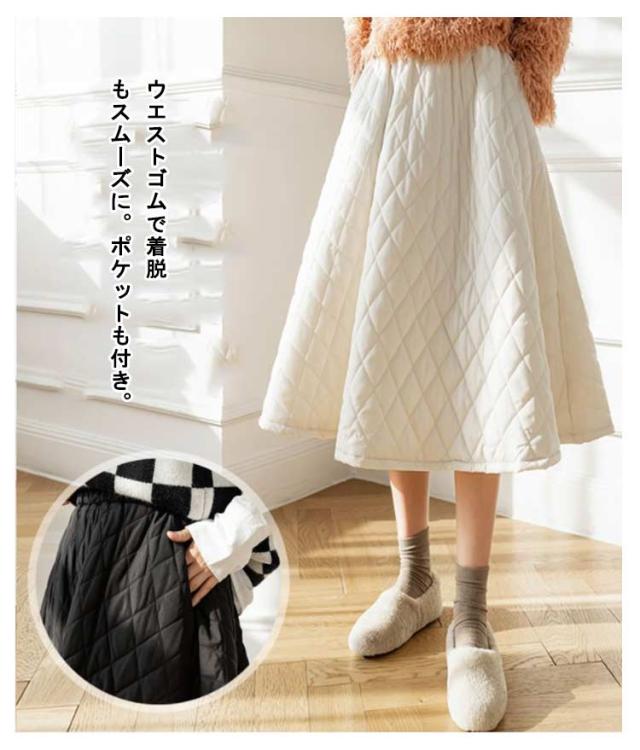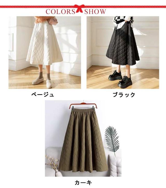 スカート キルティングスカート 中綿 ミモレ丈 膝下 ロングスカート フレアスカート Aライン ウエストゴム 暖かい 冬服 レディース 可愛い あったか ボトムス きれいめ ハイウエスト シンプル 通勤 オフィス 大きいサイズ カーキ 黒 ベージュ 送料無料