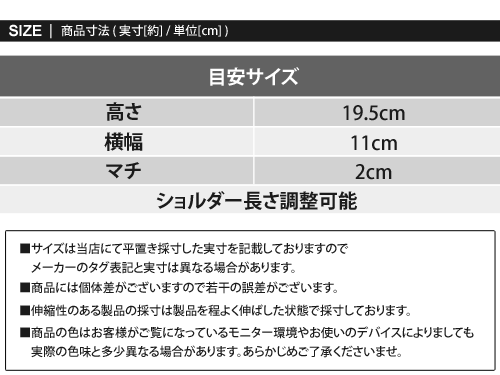 | サイズ | 高さ 19.5cm 横幅 11cm マチ 2cm ショルダー長さ調整可能 |
