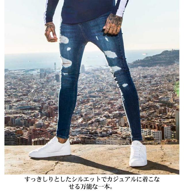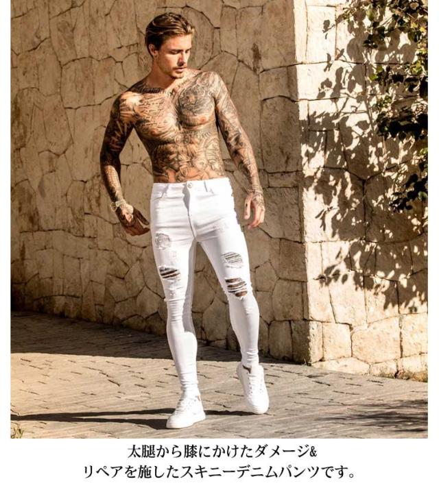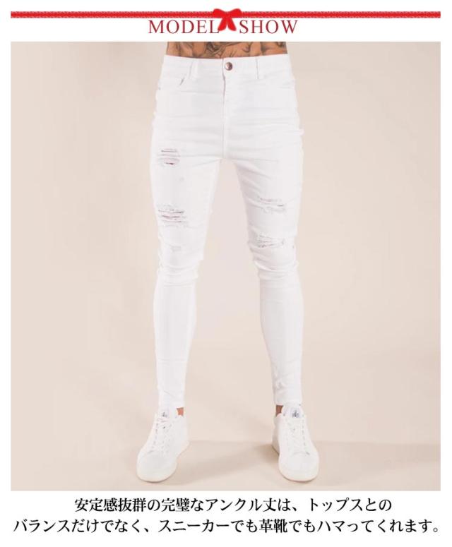 | 大人気のダメージ&スキニージーンズからアンクルタイプの登場! S-5XLサイズあり! 安定感抜群の完璧なアンクル丈は、トップスとのバランスだけでなく、スニーカーでも革靴でもハマってくれます。 太腿から膝にかけたダメージ&リペアを施したスキニーデニムパンツです。 極細シルエットでかつ穿き心地をさらに良くするためにストレッチ性が強いデニム生地をさらに改良。 お尻までスーパーストレッチで、伸びやかな穿き心地ときれいなラインを叶える1本になっています。 すっきしりとしたシルエットでカジュアルに着こなせる万能な一本。 | |