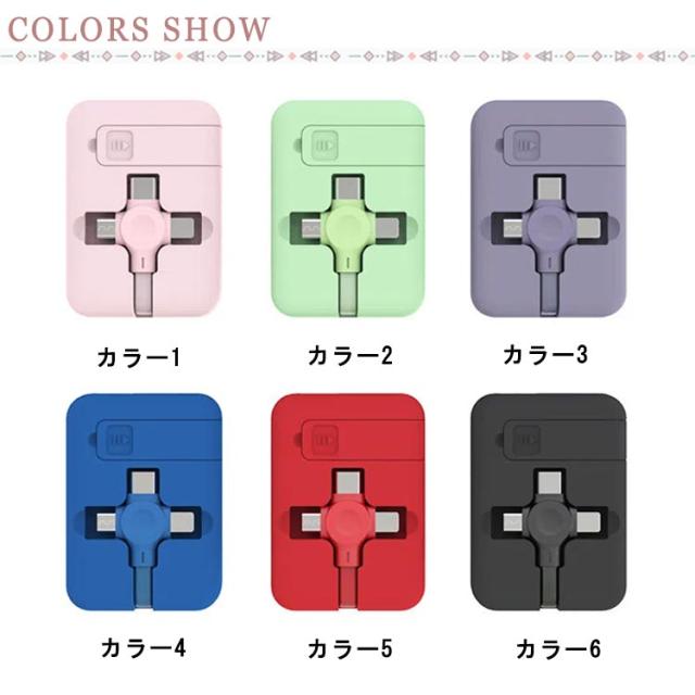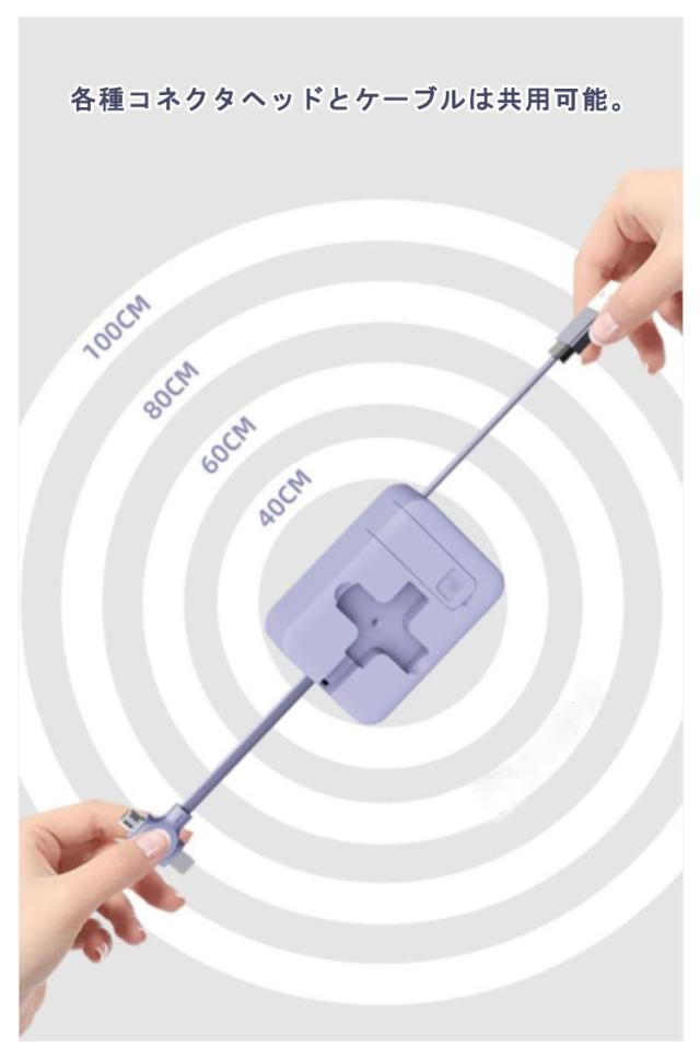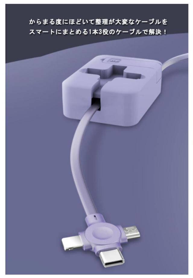 | 持ち運びの際にカバンの中で巻き取り式ケーブル。 からまる度にほどいて整理が大変なケーブルをスマートにまとめる1本3役のケーブルで解決!万一の時にお出かけ時に持っていると便利、出張や旅行に最適。 各種コネクタヘッドとケーブルは共用可能。 ケーブル1本でiPhone, microUSB, Type-Cの接続が可能なのでごちゃごちゃせずスッキリします。 | |