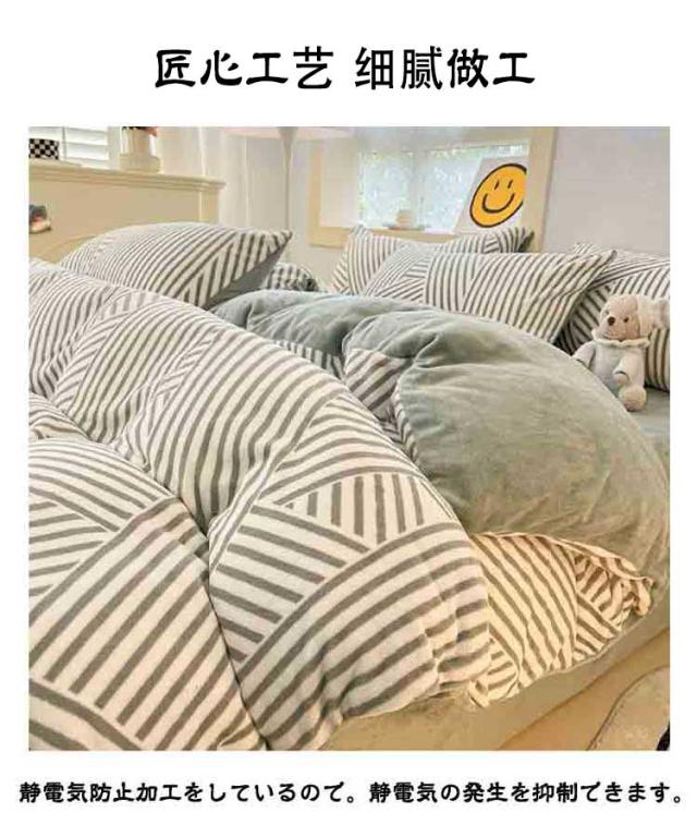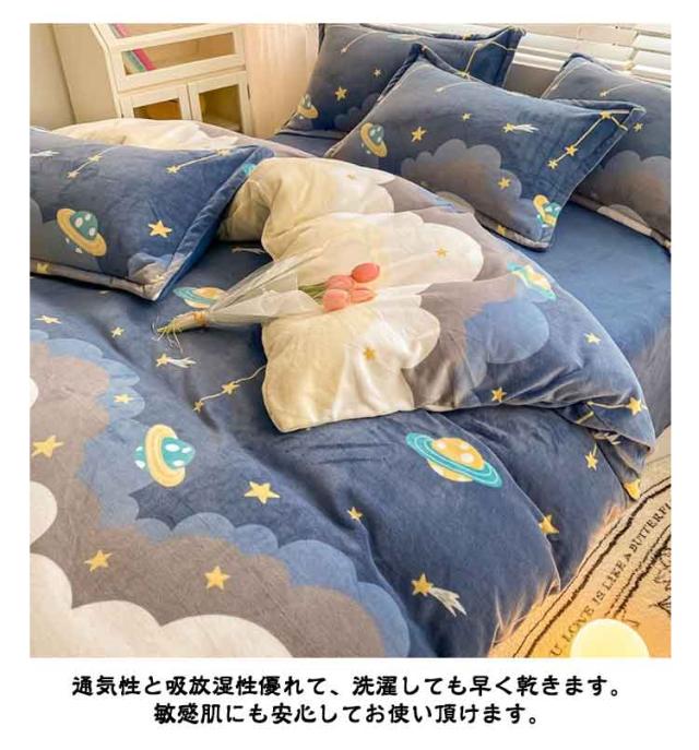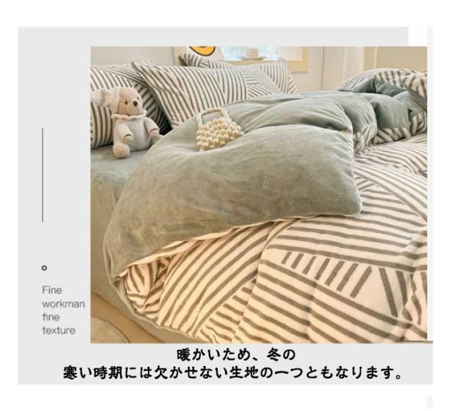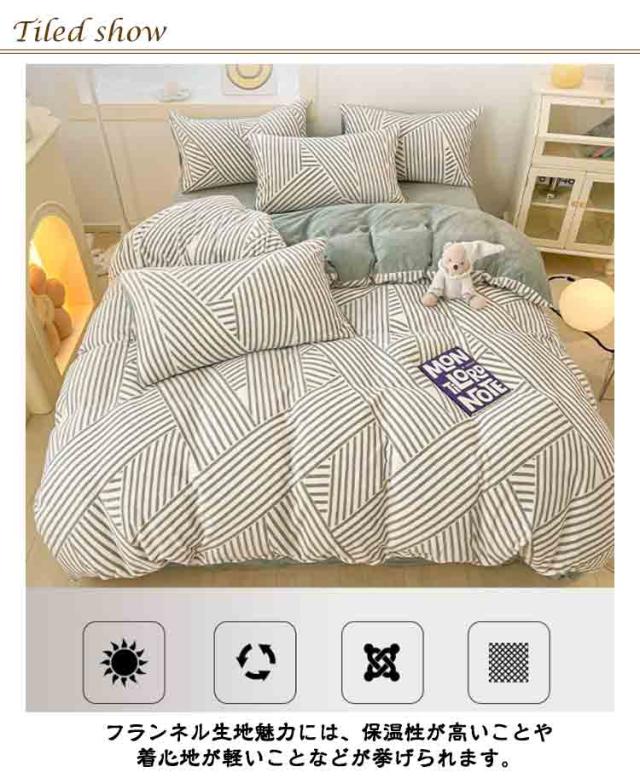 | 【柔らかくて暖かい】フランネル生地魅力には、保温性が高いことや着心地が軽いことなどが挙げられます。暖かいため、冬の寒い時期には欠かせない生地の一つともなります。お布団に入ったときの冷たさを軽減し、快適に休みます。 【静電気防止】静電気防止加工をしているので。静電気の発生を抑制できます。 【丸洗いOK!】毎日素肌に触れる布団カバーは、いつも清潔なものを使いたいと思います。このカバーセットなら、寝具をいつも清潔と快適に保てます。 【ツルツル・爽やか】通気性と吸放湿性優れて、洗濯しても早く乾きます。敏感肌にも安心してお使い頂けます。 | |