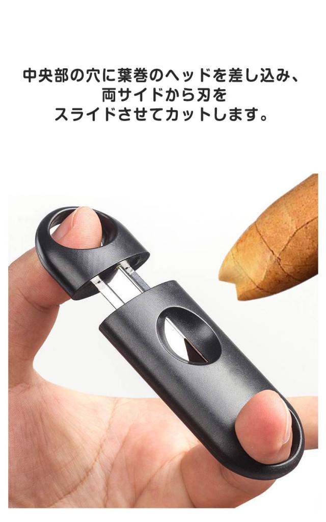 | 直径20ミリまでの葉巻に対応可能なシガーカッターです 軽量かつポケットサイズで持ち運びが非常に便利 中央部の穴に葉巻のヘッドを差し込み、両サイドから刃をスライドさせてカットします。 切断面がシガーに対して垂直になるようにし、ヘッドに多少丸みを残すのがコツです。 | |
