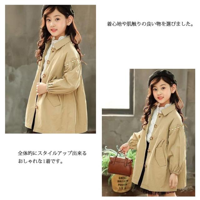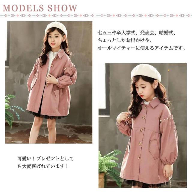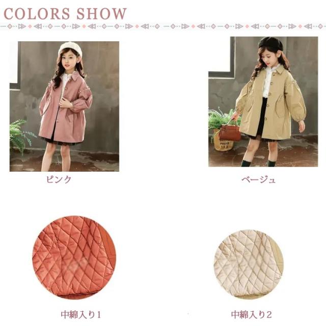 姫系 トレンチコート キッズ 中綿入り コート ライトアウター 長袖 子供服 子ども服 女の子 スプリングコート バルーン袖 パール カジュアル 春服 秋服 冬服 キッズ 通学 入学 発表会 ピンク ベージュ フリル 110 120 130 140 150 160
