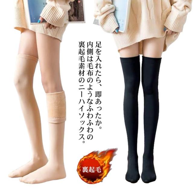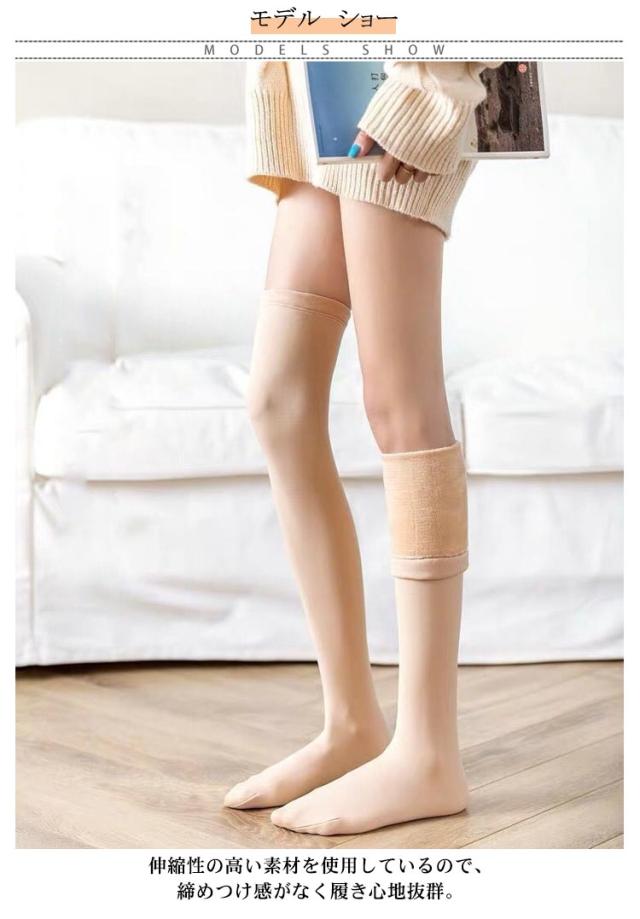 | 足を入れたら、即あったか。内側は毛布のようなふわふわの裏起毛素材のニーハイソックス。 伸縮性の高い素材を使用しているので、締めつけ感がなく履き心地抜群。 ロングスカートやワンピースの下にもおすすめ◎ 冷たい空気が入りにくく、真冬の防寒対策にぴったりのアイテムです。 | |