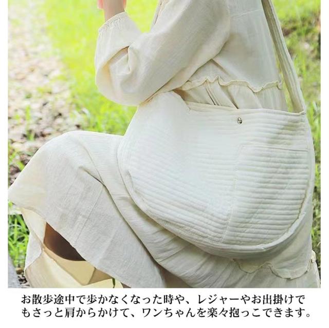| いつでも一緒にお出掛け出来ちゃう! 素材もしっかりしていますのでワンちゃんの安定感もバッチリです。 ご主人様の肩にも負担軽減! 安定感があるのでワンちゃんをやさしく包み込みます。 しっかりした軽い綿とポリエステル素材で、肩部分も広めなので負担も少なく襷掛け出来るので便利。 荷物で両手がふさがってしまってもわんちやんをだっこできますので便利です。 また、非常に軽く携帯にも大変便利です。 お散歩途中で歩かなくなった時や、レジャーやお出掛けでもさっと肩からかけて、ワンちゃんを楽々抱っこできます。 ワンちゃん、ネコちゃんはオーナー様に抱っこされることで安心しくつろぐことができます。 | |