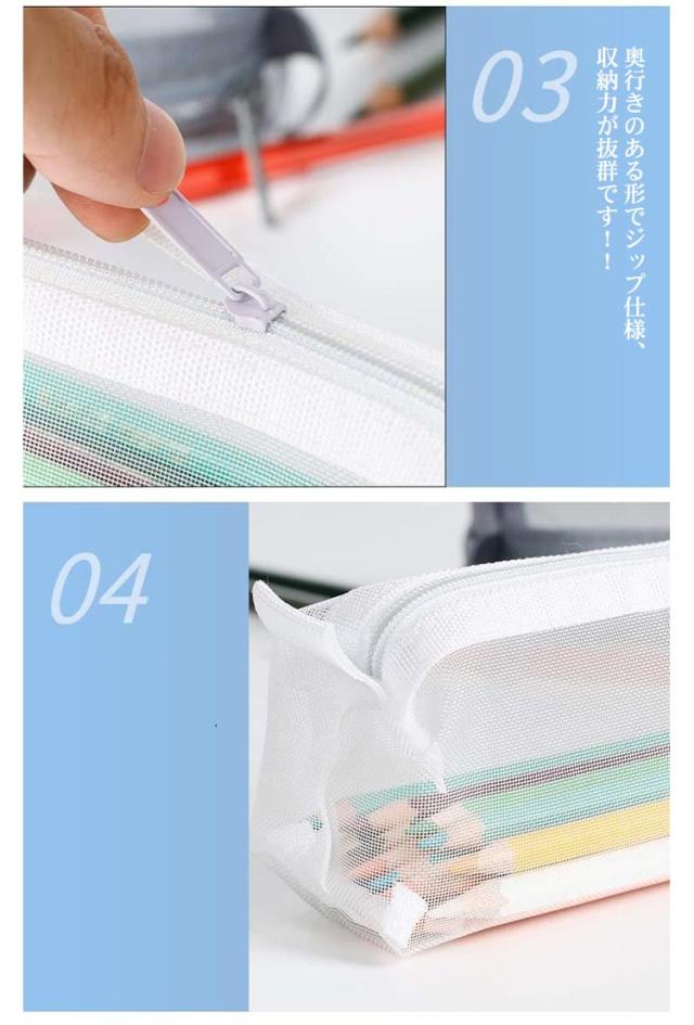| メッシュ生地だから滑りにくく半透明で中身の確認ができる。 友達とお揃いも素敵な透明ペンケース。受験用にも大活躍! 丈夫なナイロン素材で長持ちできる!! 派手すぎない地味すぎないお洒落なメッシュペンケース。 掴みやすい引手付きで、ファスナーの開け閉めのスームズ♪ 奥行きのある形でジップ仕様、収納力が抜群です!! 透ける筆箱なのでどこに何が入っているのか探しやすいです。 しんぷるでオシャレなデザイン構造のぺんけーすなので、男の子や女の子、小学生の子供も文房具の収納に使えます。 | |