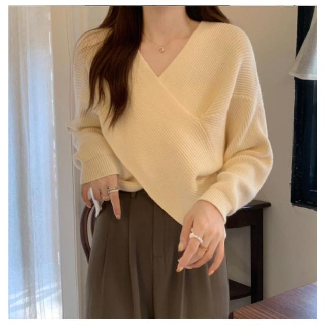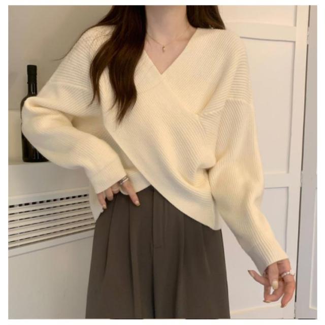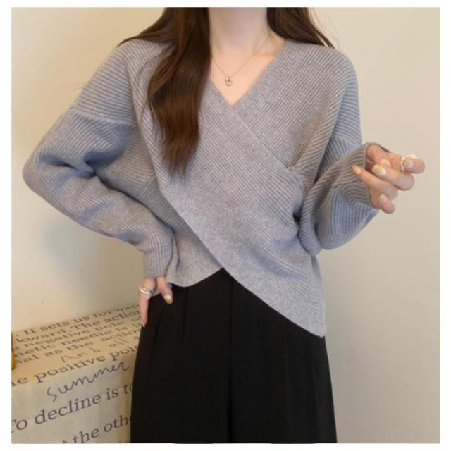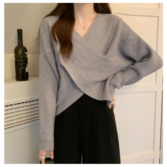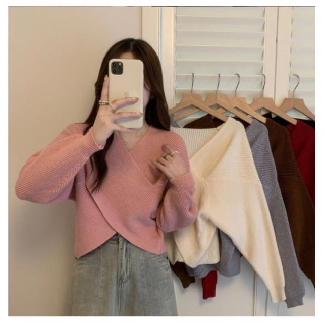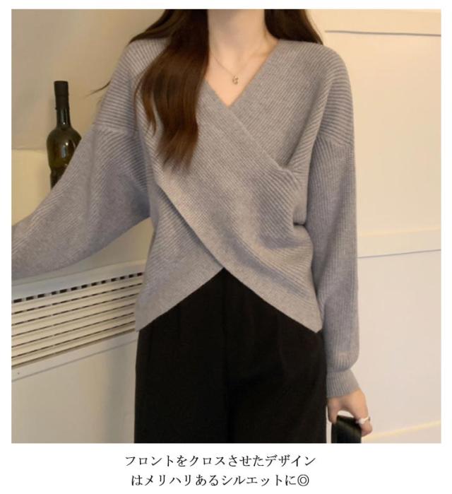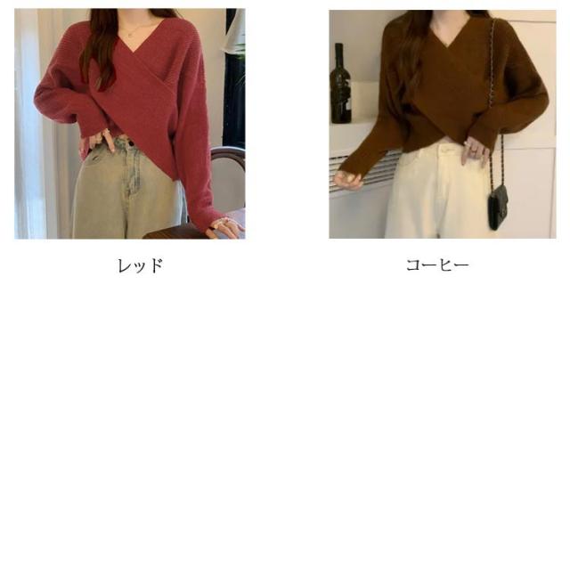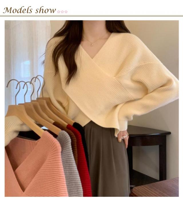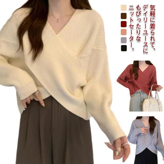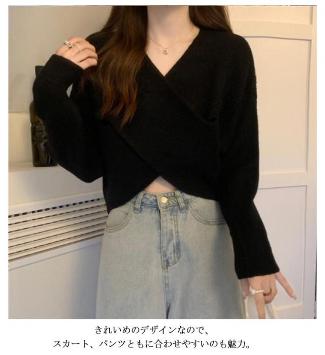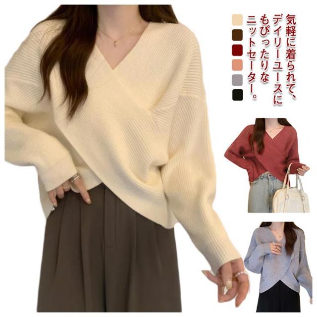 ニットセーター カシュクール 長袖 リブニット レディース クロス ショート丈 Vネック セクシー トップス ドロップショルダー カジュアル 大人女子 無地 秋冬 ゆったり お洒落 キレイめ 送料無料