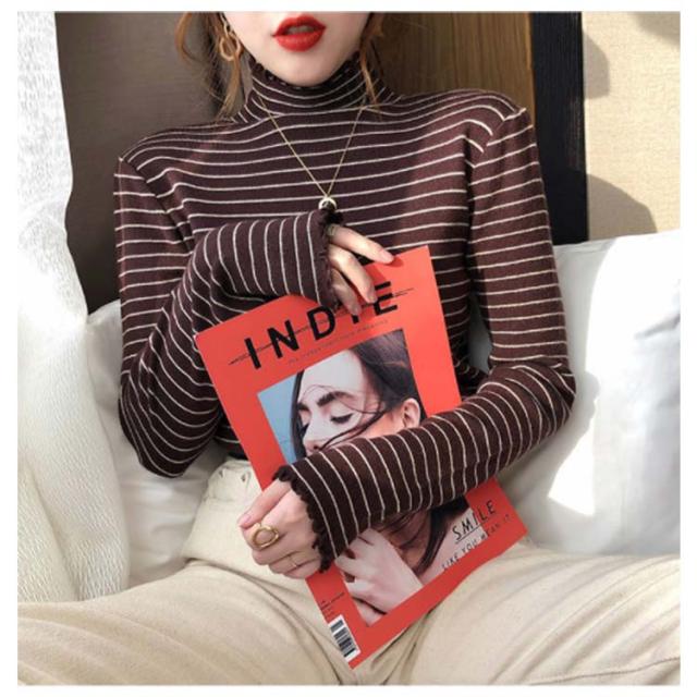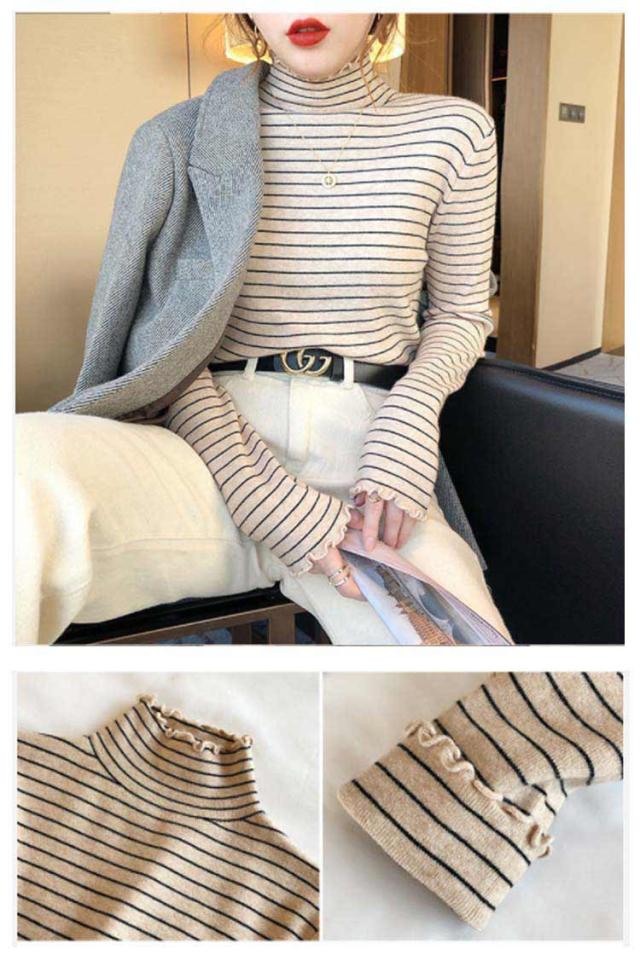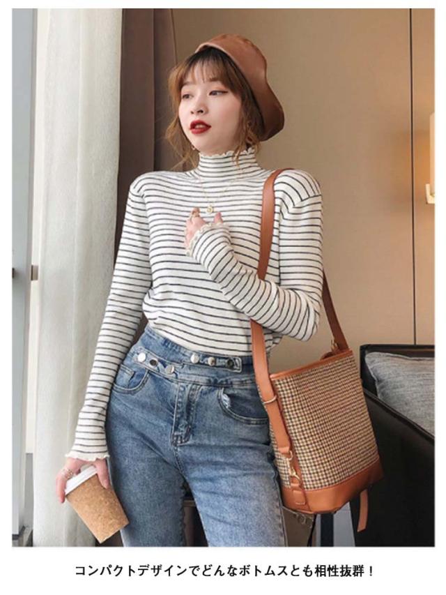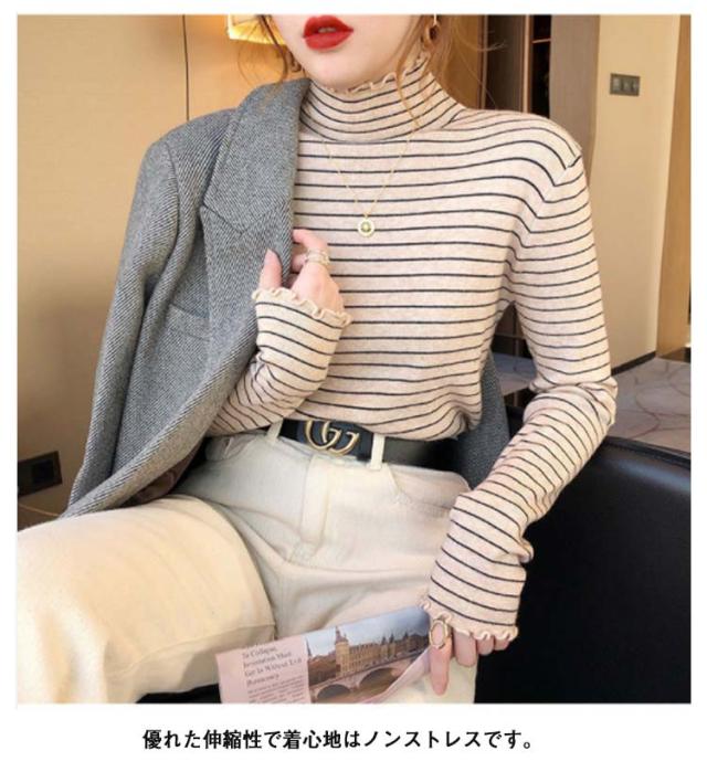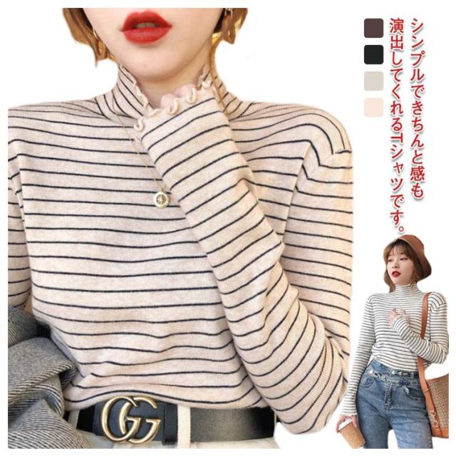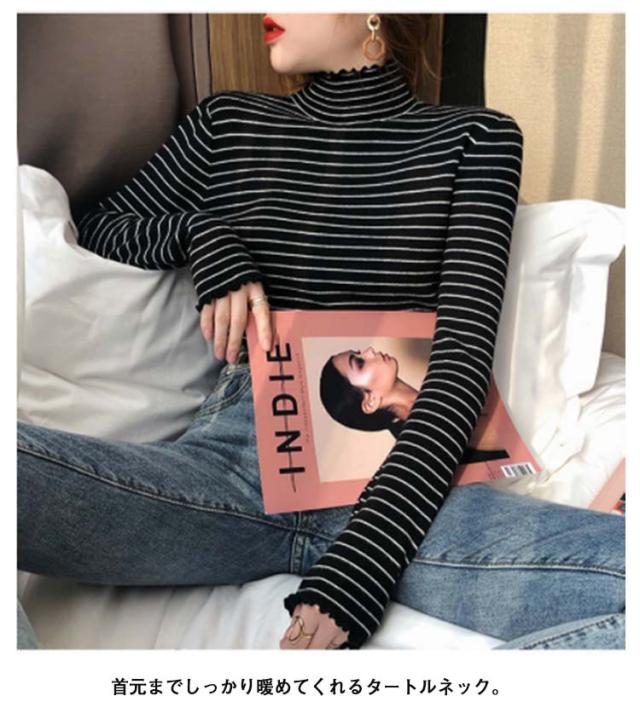 ボーダー フリル タートルネック カットソー Tシャツ 長袖 トップス シンプル 重ね着 きれいめ カジュアル ゆったり 秋冬 韓国ファッション お洒落 保温 寒さ対策 ストレッチ 送料無料