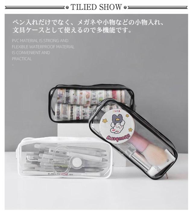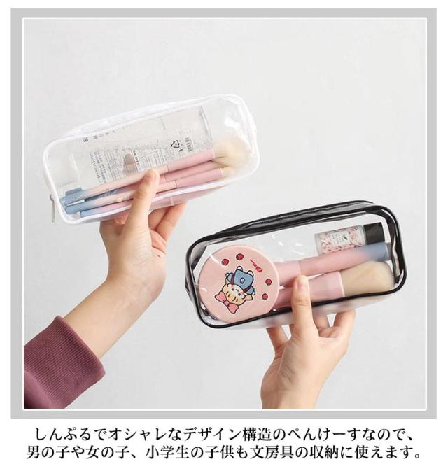| シンプルでお洒落!かわいい透明ペンケース・ペンポーチ! ペン入れだけでなく、メガネや小物などの小物入れ、文具ケースとして使えるので多機能です。 軽量すりむで持ち運び、持ち歩きにも便利です。 透明度の高いクリアーな素材で、中身がハッキリと際立って見える! 透ける筆箱なのでどこに何が入っているのか探しやすいです。 しんぷるでオシャレなデザイン構造のぺんけーすなので、男の子や女の子、小学生の子供も文房具の収納に使えます。 | |