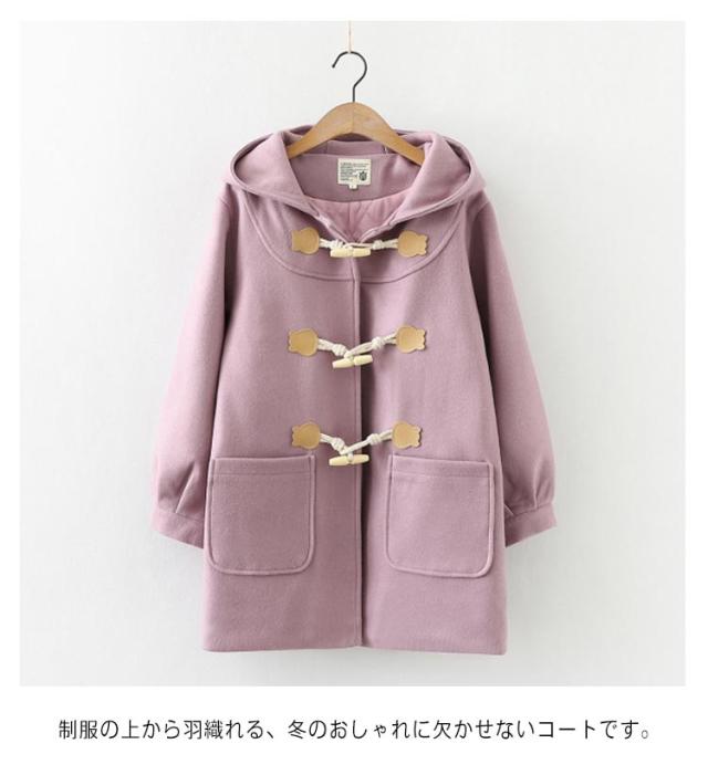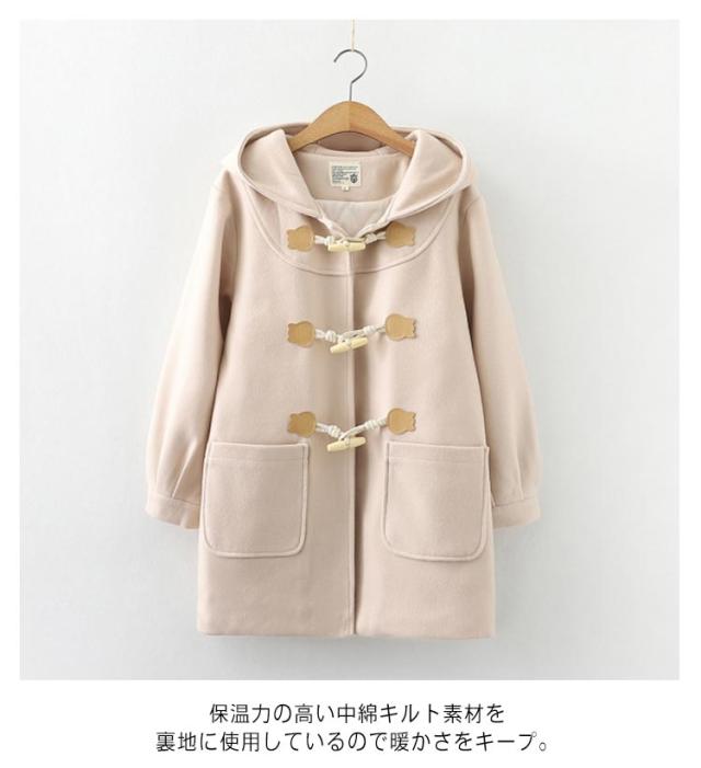 | 冬の制服コーデに欠かせないスクールコート! 保温力の高い中綿キルト素材を裏地に使用しているので暖かさをキープ。 フードや大きめボタンがかわいいダッフルコート! ダッフルコートは、トグル(留め具)をループにかけて留めるタイプとなっているので、忙しい朝でもさっと羽織ってしっかり防寒できます。 ヒップもすっぽりカバーするロング丈で合わせるボトムスを選ばず、カジュアルからガーリーまで幅広いコーデに活躍! 制服の上から羽織れる、冬のおしゃれに欠かせないコートです。 カジュアルにも通学にも最適な秋冬定番人気のダッフルコートです。 | |