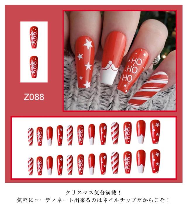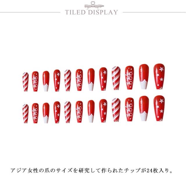 | 【商品名】ネイルチップ 【セット内容】24枚入り 【素材】プラスチック 【特徴】特別な日のネイルに最適のロングタイプネイルチップ。 クリスマス気分満載!気軽にコーディネート出来るのはネイルチップだからこそ! 忙しくてサロンに行けない方にぴったり☆自分の爪にサイズに合わせて貼るだけ! 柔らかな素材で出来ているので、自爪のような感覚でぴたっと密着し、まるでサロンで仕上げたようなツヤのあるネイルが簡単に仕上がります。 アジア女性の爪のサイズを研究して作られたチップが24枚入り。 | |