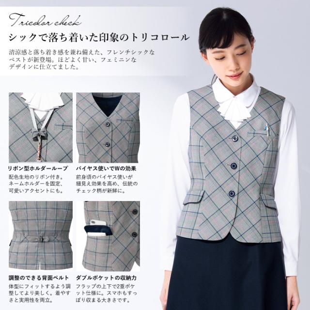 事務服 ベスト レディース スーツ 制服 nuovo 春夏 秋 FOLK リボン ホルダーループ付き【送料無料】トリコロール グレンチェック 女性 医療事務 受付 接客 冠婚葬祭 セレモニー オフィス 名札 ポケット 前開き 大きいサイズ おうちで洗える おしゃれ